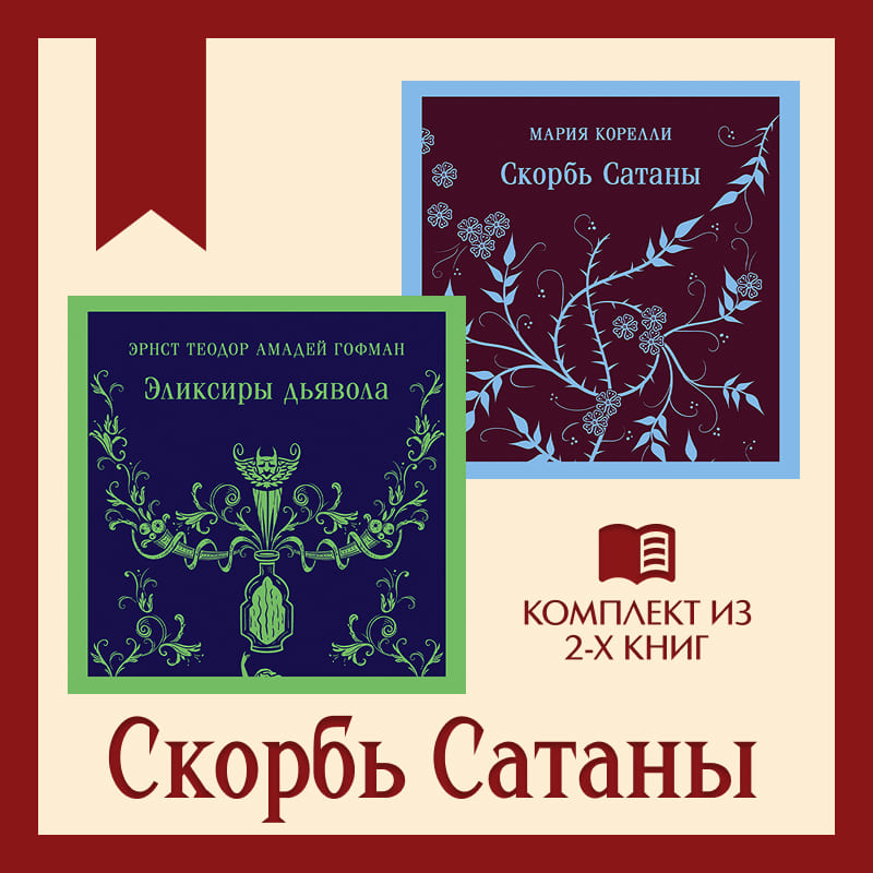 В комплект входят 2 книги: "Скорбь сатаны" Марии Корелли и "Эликсиры дьявола" Гофмана. Романы объединяет много тем - от поиска, исследования бытия, до расплаты и наказания - и конечно, образ сатаны, который подан во всех трёх произведениях по-разному.