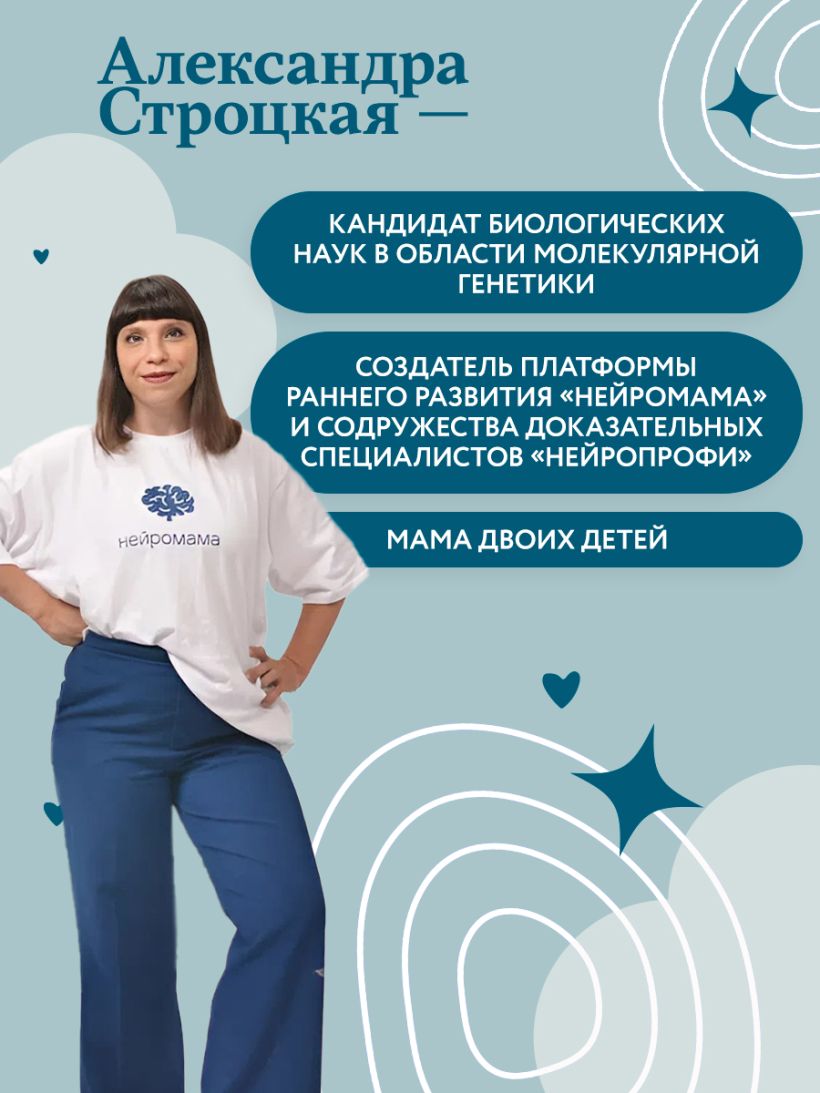 Александра Строцкая — кандидат биологических наук в области молекулярной генетики, создатель платформы раннего развития «Нейромама» и содружества доказательных специалистов «НейроПрофи». Работала в Институте Биологии гена и молекулярной генетики в США, в московском Сколтехе и в Политехническом университете Санкт-Петербурга. Также занималась исследованиями в Научно-исследовательском комплексе «Нанобиотехнологии».