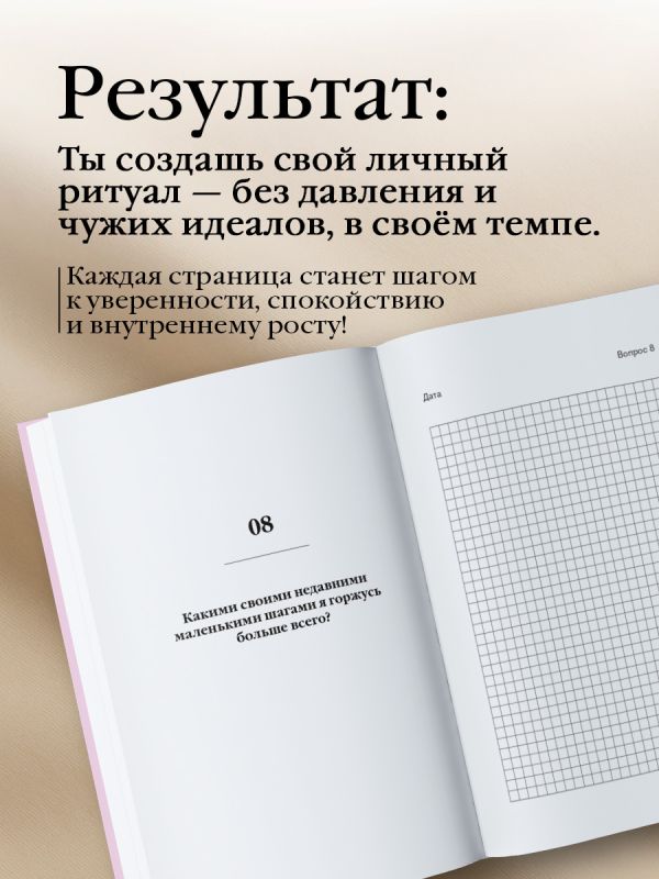 Вместо сухих чек-листов — вопросы, которые раскрывают тебя. Каждая страница помогает увидеть следующий маленький шаг, а не давит глобальными «надо».
