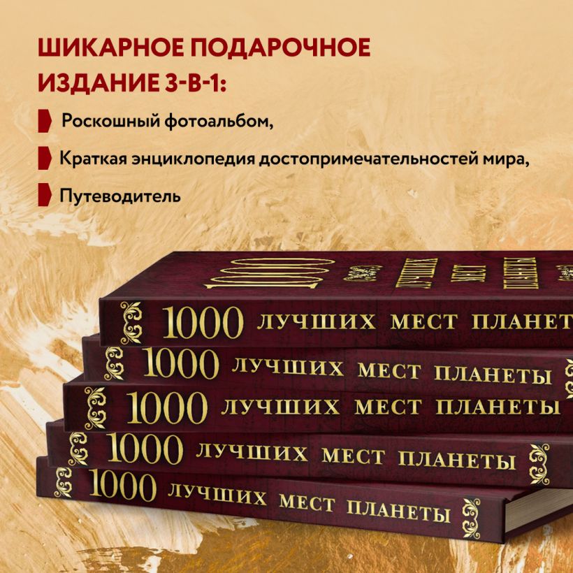«1000 лучших мест планеты» — ваш счастливый билет для воплощения абсолютно безопасного и незабываемого кругосветного путешествия. Вы побываете в самых необычных местах нашей удивительной планеты и увидите впечатляющие памятники архитектуры не выезжая из страны благодаря красочному иллюстративному сопровождению.