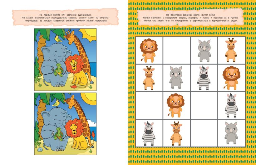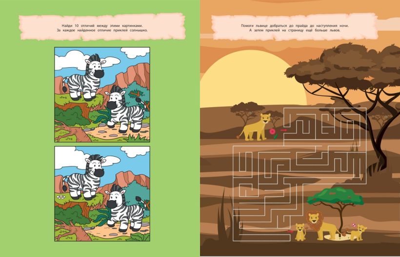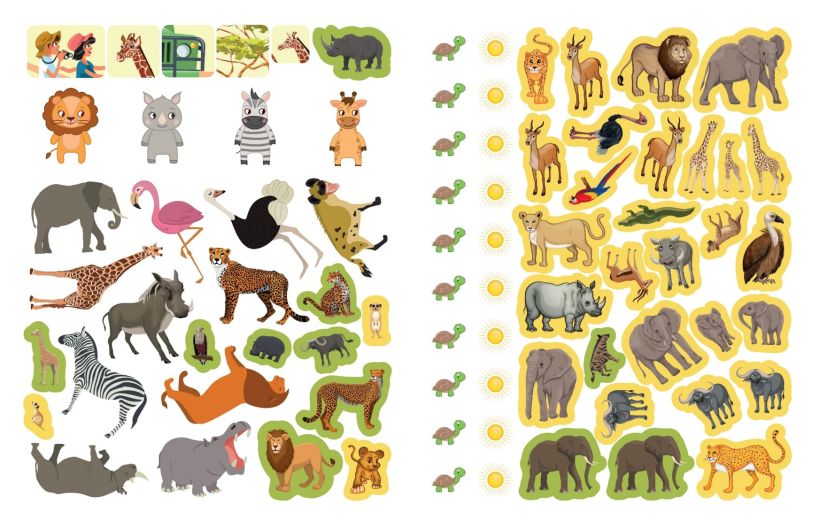 Внутри книги дети найдут яркие и красочные сцены с разнообразными животными, характерными для саванны. С помощью 150 наклеек они смогут оживить эти пейзажи.