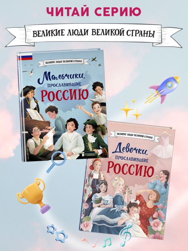 Отправляйтесь в захватывающее путешествие по разным эпохам нашей страны! Вы хотите познакомить вашего ребёнка с известными людьми России — Петром I и Суворовым, Пушкиным и Чайковским, Ломоносовым и Гагариным? Узнать, во что играли будущие исторические личности? Чем увлекались в детстве? Как искали свою судьбу, искали себя на нелёгких жизненных дорогах? Ведь они так же, как и все мы, одолевали за партой неподдающиеся науки, отстаивали собственное мнение в спорах; у них были свои детские огорчения и радости. И далеко не всё получалось с первого раза... Тогда открывайте эту книгу! В каждом из 20 биографических рассказов, адаптированных для детей 7—10 лет, — невероятный образец силы воли и стойкости характера, мотивирующий ребят на собственные свершения. Их сопровождают красочные полосные иллюстрации и занимательные факты, чтобы знакомиться с выдающимися соотечественниками было наглядно и увлекательно. А ещё это неповторимый подарок для всех, кто гордится историей и культурой своего Отечества! Книги серии получили заслуженно высокую оценку — в 2024 году они были номинированы на премию Российского общества «Знание» в категории «Лучшая просветительская книга».