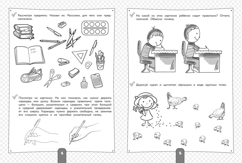 Поступление в 1 класс — важнейший этап в жизни ребёнка, и к нему нужно хорошо подготовиться. Тренажёр включает в себя задания разного типа на проверку степени усвоения базовых навыков и умений, необходимых для дальнейшего обучения. С помощью пособия можно проверить у дошкольника уровень развития произвольного внимания, слуховой и зрительной памяти, способности к переключению и удержанию внимания и понять: умеет ли он находить одинаковые рисунки, предметы такие же, как в рамке; дорисовывать по образцу; искать то, что спрятано на картинке; сопоставлять предмет с его тенью; обводить по условию. Задания, представленные в тренажере, помогут оценить способности ребёнка, определить, с чем он справляется успешно, и выделить те области, которые вызывают у него затруднения. Книга-развивашка от издательства «Эксмо» будет полезна девочкам и мальчикам 5, 6, 7 лет для подготовки к школе. Рекомендуем также приобрести пособия: «Чтение», «Графические навыки», «Логическое мышление», «Первая математика».
