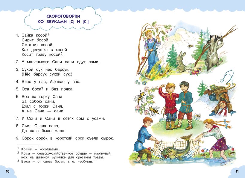 Скороговорки иллюстрируют яркие сюжетные рисунки. Они помогут ребенку понять содержание прибауток, поэтому заниматься ему будет весело и интересно.