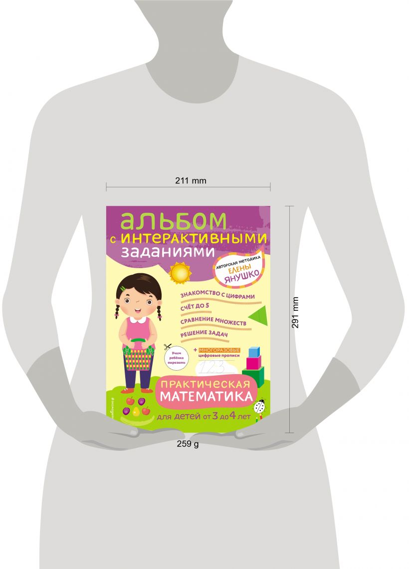 На каждом листе книги ребенку предлагается вырезать разные фигурки и картинки, которые потом надо использовать при выполнении заданий. Манипуляции с ножницами, бумагой, клеем развивают моторику ребенка, учат аккуратности, точности движений и стимулируют интеллектуальное развитие — математика становится понятной и легкой!