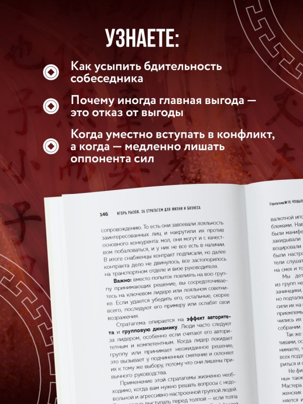 Стратагема — это военная хитрость для жизни. Выверенный алгоритм поведения, который позволяет играть на опережение, избегать ненужных конфликтов и находить скрытые ресурсы как в бизнесе, так и в жизни в целом. Мир знает 36 китайских стратагем. Российский эксперт по переговорам Игорь Рызов адаптировал их к современной российской реальности и многократно проиллюстрировал на простых и понятных примерах.