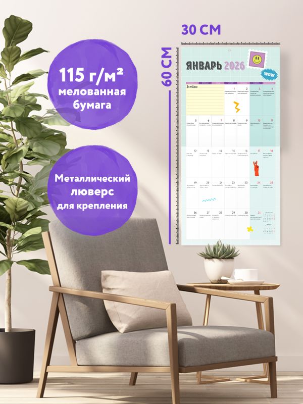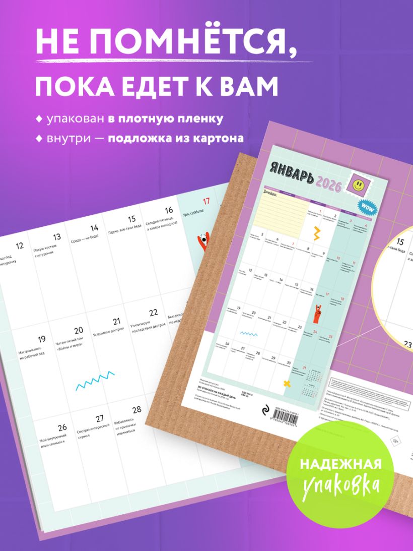 О серии: Наши настенные календари отличаются высоким качеством исполнения! Тщательно подобранные иллюстрации, напечатанные на глянцевой бумаге высочайшего качества, станут настоящим украшением дома, а в календарной сетке найдется место для ваших планов: большие клетки позволят делать записи и организовать свой год! В календаре также отмечены все государственные праздники. В серии настенных календарей издательства «ЭКСМО» каждый найдет тему по вкусу: великие художники, великолепные подборки с самыми знаменитыми произведениями искусства, легендарные кинематографические саги и игры, главные книжные авторы и бестселлеры, фотографии и иллюстрации любимых животных и многое-многое другое! О календаре: Настенный календарь-планер на 2026 год позволит вашей семье не упустить ни одного важного события! Он избавит вас от необходимости держать в памяти даты и время встреч, командировок, родительских собраний, кружков и любых других мероприятий. А красивые и забавные иллюстрации в удобных таблицах будут радовать всю семью целый год! Пользоваться календарем-планером приятно и легко. Внутри — таблица с пятью колонками для записи имен членов семьи, планов и событий, а также дополнительные линейки для особо важных дел или дней рождения. Для кого: Каждый разворот отведен под один месяц, а в конце планера вы найдете страницу для творчества всей семьей и календарь на 2027 год. Технические параметры: - Тип календаря — настенный перекидной. - Год — 2026. - Календарная сетка — с разбивкой по месяцам. - Вид скрепления — скрепка. - Ширина — 30 см. - Высота — 30 см. - Внутренний блок — мелованная бумага 150 г/м2. - Подложка — плотный гофрокартон для поддержания формы. - Индивидуальная упаковка в плотный целлофановый пакет.