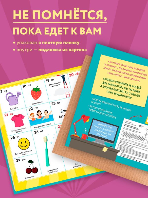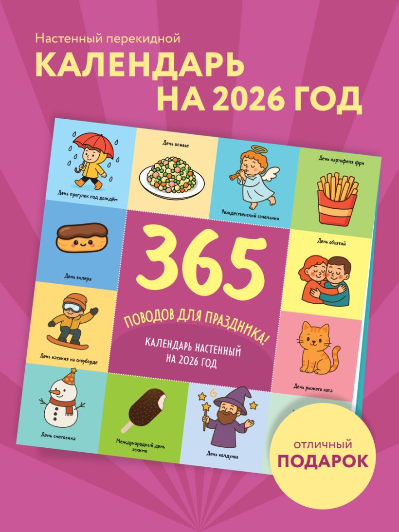 Встречайте новый день с улыбкой вместе с настенным календарем на 2026 год «365 поводов для праздника!». С ним вы точно не пропустите Всемирный день лягушки, узнаете, когда празднуют свои дни рождения автомобиль и стиральная машина, а еще — не забудете поздравить друзей и близких с Днем объятий! Все 12 месяцев украшены добрыми и яркими иллюстрациями, которые поднимут настроение. Каждый разворот календаря отведен под один месяц, а на последних страницах вы найдете полный календарь на 2027 год.