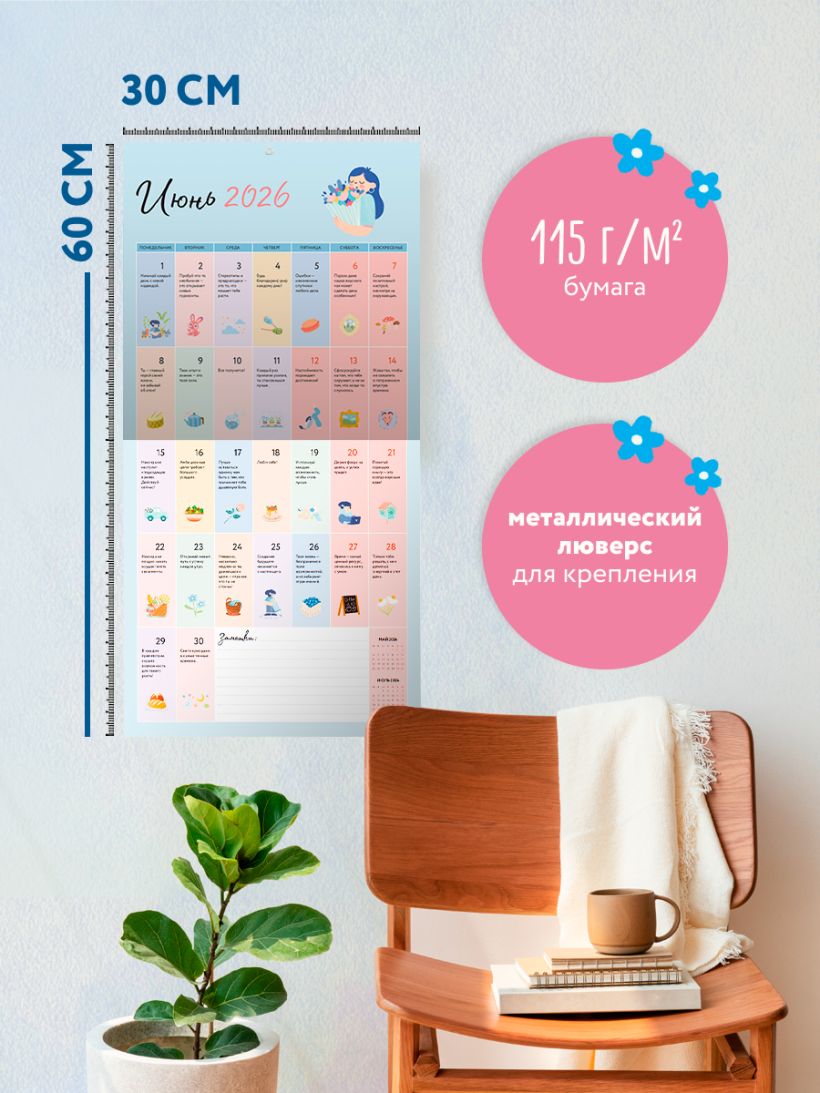 Календарь Татьяны Мужицкой с яркими иллюстрациями от Влады Коваль! В сетке — вдохновляющие цитаты автора и необычные праздники вроде «Всемирного дня “Спасибо”» и «Международного дня заботы о себе». Каждый месяц — как напоминание: жить можно с радостью, легкостью и любовью к себе. Совокупный тираж книг Татьяны Мужицкой — 360 000 экземпляров. Наши настенные календари отличаются высоким качеством исполнения! Тщательно подобранные иллюстрации, напечатанные на глянцевой бумаге высочайшего качества, станут настоящим украшением дома, а в календарной сетке найдется место для ваших планов: большие клетки позволят делать записи и организовать свой год! В серии настенных календарей издательства «ЭКСМО» каждый найдет тему по вкусу: великие художники, великолепные подборки с самыми знаменитыми произведениями искусства, легендарные кинематографические саги и игры, главные книжные авторы и бестселлеры, фотографии и иллюстрации любимых животных и многое-многое другое! Технические параметры: - Тип календаря — настенный перекидной. - Год — 2026. - Календарная сетка — с разбивкой по месяцам. - Вид скрепления — скрепка. - Ширина — 30 см. - Высота — 30 см. - Внутренний блок — мелованная бумага 150 г/м2. - Подложка — плотный гофрокартон для поддержания формы. - Индивидуальная упаковка в плотный целлофановый пакет.