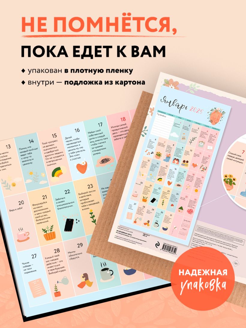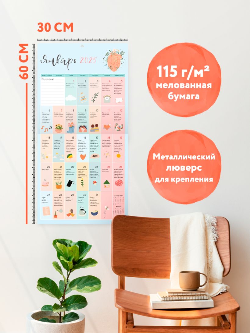 Настенный календарь, который обнимет и согреет! В нем собраны поддерживающие слова на каждый день, которые мотивируют никогда не сдаваться. Только обладая уверенностью в себе и своих силах, можно добиваться любых высот. Календарь создан совместно с психологическим проектом lea.helps (более 38,9 тыс. подписчиков). В нем участвуют как реальные специалисты, так и виртуальный ИИ-психолог. Календарь впишется в любую рабочую атмосферу, в нем нет ярких или раздражающих цветов. На каждый месяц предусмотрено место для личных заметок.