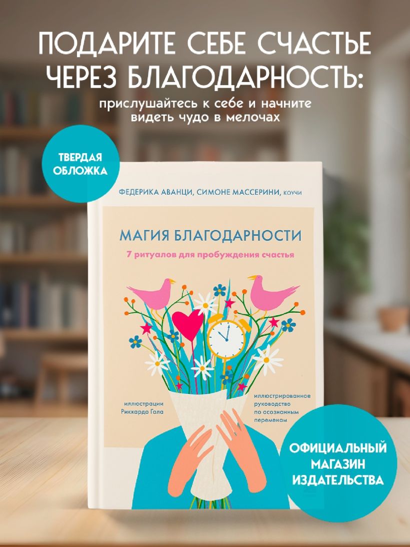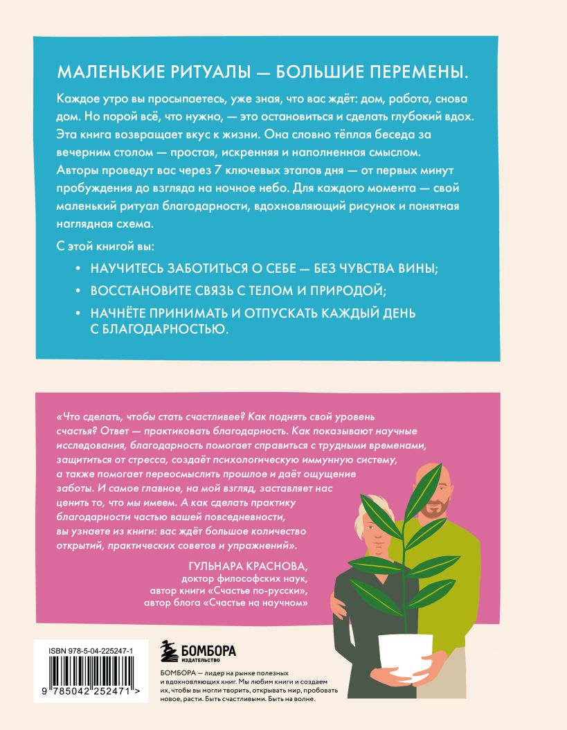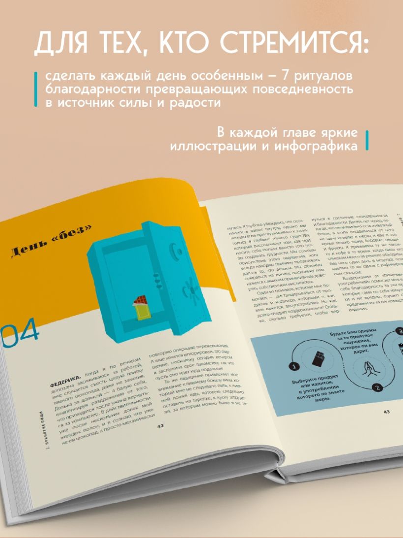 Авторы проведут вас через 7 ключевых этапов дня — от первых минут пробуждения до последнего взгляда на ночное небо. Для каждого момента — свой маленький ритуал благодарности, который завершается практичными советами и понятной схемой.
