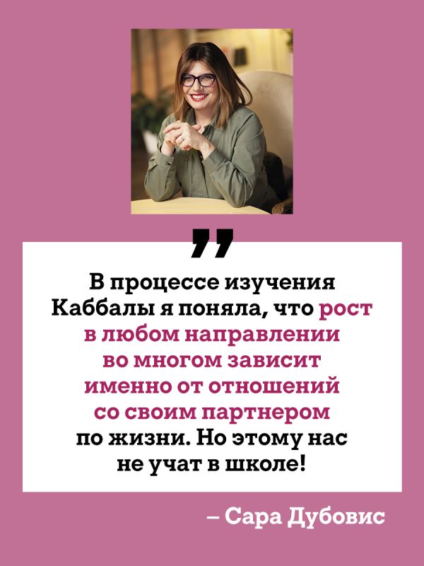 «В процессе изучения Каббалы я поняла, что рост в любом направлении во многом зависит именно от отношений со своим партнером по жизни, — говорит Сара Дубовис. — Но этому нас не учат в школе!»