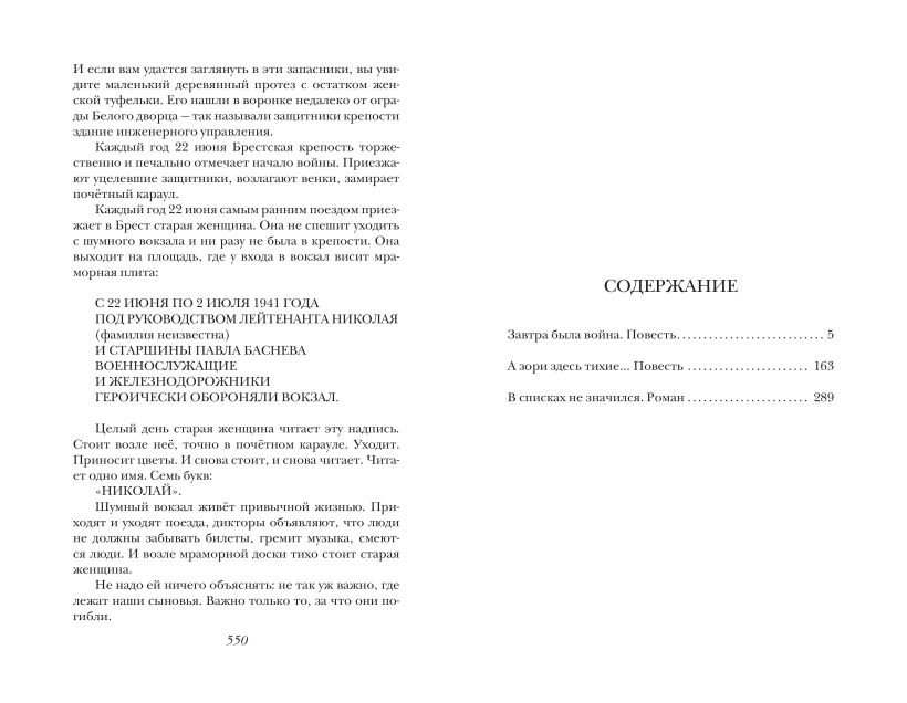 В книгу вошли повести «Завтра была война», «А зори здесь тихие…» и роман «В списках не значился».