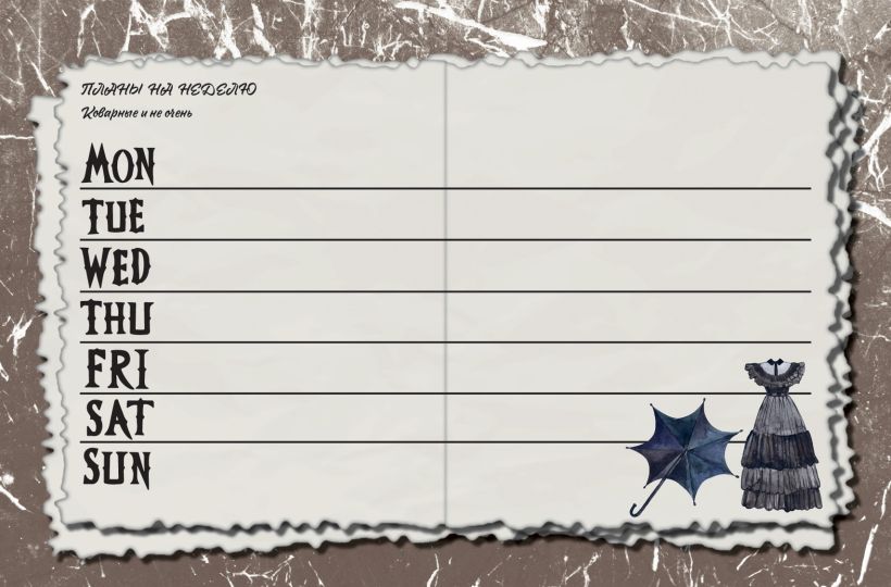 Уникальный скетчбук по мотивам культового сериала! Хочешь хранить свои тайны в укромном месте? Тогда этот дневник точно для тебя! Внутри тебя ждут планеры, страницы для заметок и творчества, а еще крутые иллюстрации, отсылающие к сумрачной вселенной «Уэнздей». Погрузись в таинственную атмосферу любимого сериала и заполни скетчбук своими мыслями, мечтами и целями.