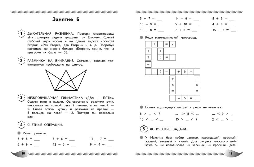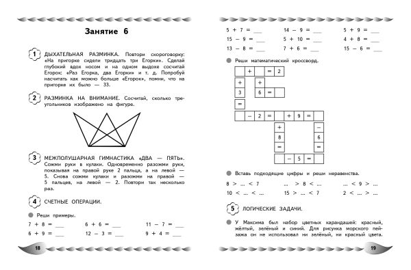 Пособие по активизации математических способностей подготовлено практикующим нейропсихологом, преподавателем НИЦ Детской нейропсихологии имени А. Р. Лурия, который каждый день помогает учащимся начальной школы справиться с возникающими проблемами в обучении. Цель книги — формирование и закрепление у детей навыков счёта, приёмов сложения и вычитания в пределах 100, приобретения опыта решения логических задач. В каждом занятии, кроме примеров на сложение и вычитание, неравенств и равенств, заданий на состав числа и составление последовательностей, решения логических задач, даются ещё и дыхательные упражнения, игры на развитие внимания и межполушарного взаимодействия, что позволит быстро и качественно обрабатывать поступающую информацию. Вопросы и задания в разделах выстроены в определенном порядке, который помогает активизировать механизмы соответствующих отделов мозга. Использование пособия по активизации математических способностей в учебном процессе или в качестве дополнительного материала позволит ребенку своевременно устранить всевозможные сложности в усвоении школьной программы и формировании необходимых навыков. Кроме того, в серию "Уроки нейропсихолога в начальной школе" входят книги: "Развитие разных видов памяти и внимания: для детей 8-10 лет", "Исправление почерка и профилактика дисграфии: для детей 8-10 лет", "Развитие навыка грамотного письма: для детей 9-10 лет", "Пишу без ошибок. Развитие орфографической зоркости: для детей 9-10 лет", Развитие математических способностей и навыков: для детей 9-10 лет", "Говорю грамотно. Развитие речевого потенциала: для детей 8-10 лет".