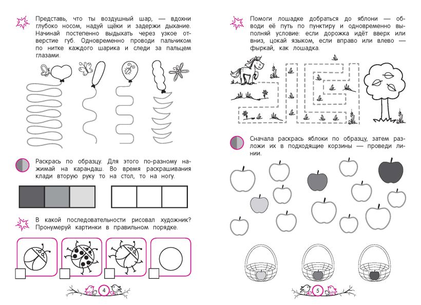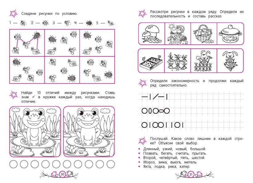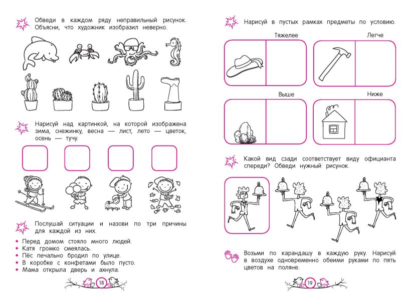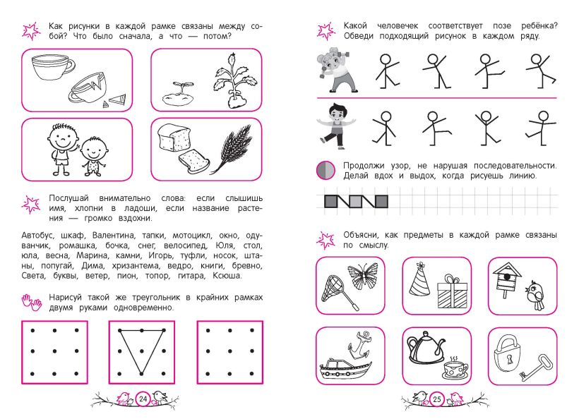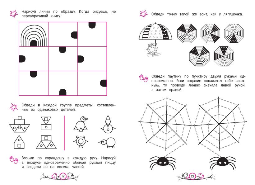 Занимаясь, ребёнок будет рисовать по точкам и обводить линии двумя руками одновременно, выполнять логические задания на ассоциации и на память, искать лишнее, дорисовывать по условию, находить спрятанные на картинке предметы, подбирать подходящие силуэты, заполнять логические квадраты, определять закономерности и продолжать последовательности.