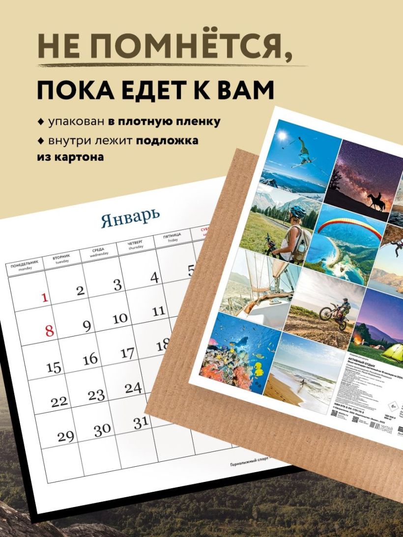 В календаре подобраны красочные фотографии с активными видами спорта. Он отлично подойдёт для любителей подобного времяпровождения. Каждый новый месяц пробудит самые искренние и высокие стремления.