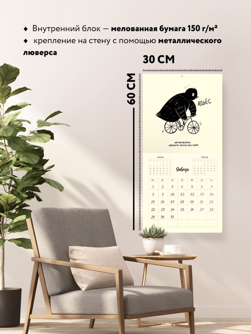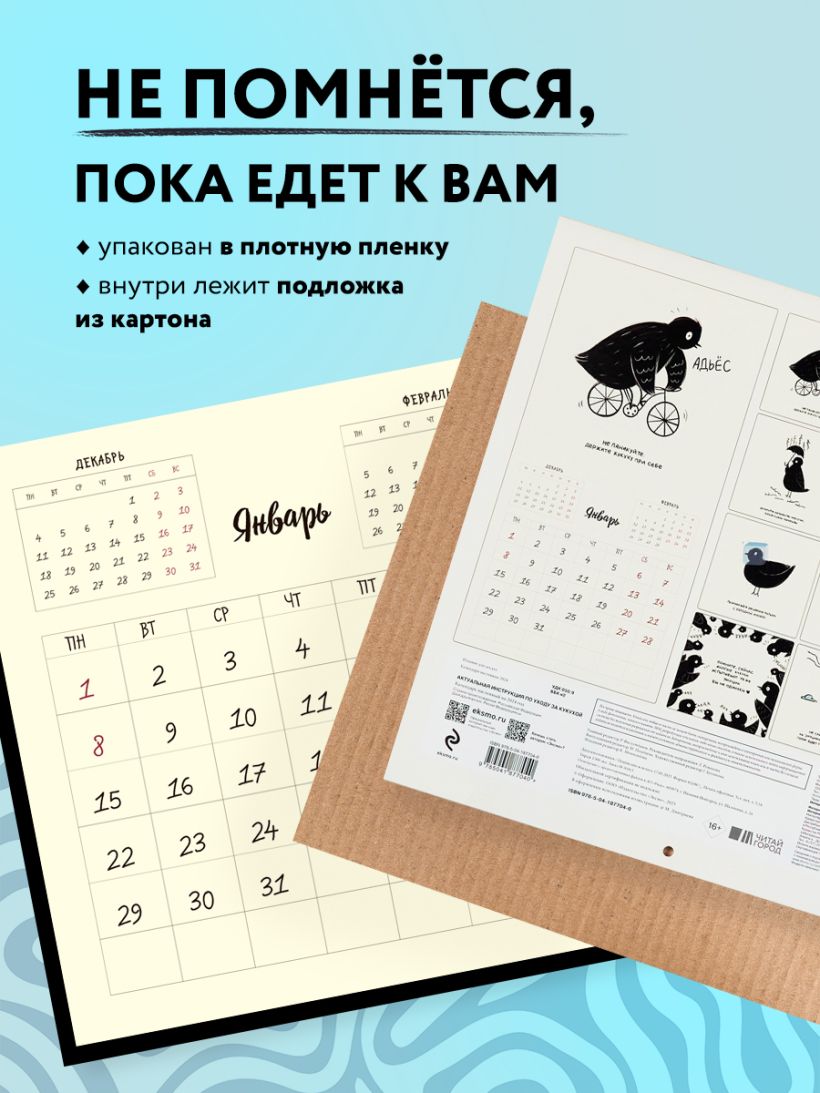 Календарь с иллюстрациями из нашумевшего комикса «Актуальная инструкция по уходу за кукухой» (более 150 тысяч лайков + 50 тысяч репостов в соцсетях). На развороте яркие кукухи, а также ироничные фразы для поддержки в трудные времена.