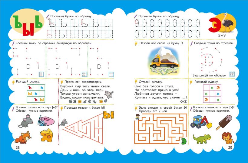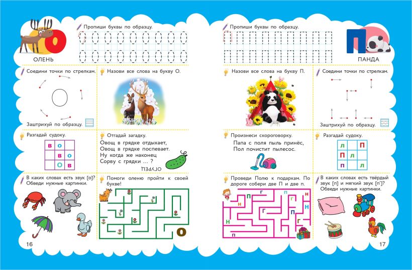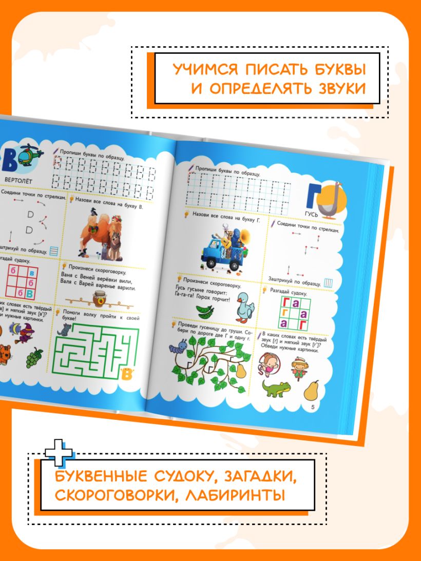 Кроме того, пособие содержит прописи для дошкольников, буквенные судоку, загадки, скороговорки, лабиринты, задания на развитие и тренировку воображения, моторики, логики, внимания и мышления. Занимаясь, ребенок будет активно готовиться к школе. Все, что для этого нужно — цветные карандаши и хорошее настроение!
