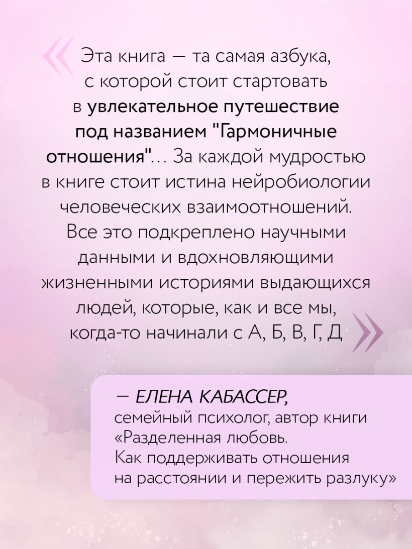 За каждой мудростью в книге стоит истина нейробиологии человеческих взаимоотношений. Все это подкреплено научными данными и вдохновляющими жизненными историями выдающихся людей, которые, как и все мы, когда-то начинали с А, Б, В, Г, Д». — Елена Кабассер, семейный психолог, Готтман-терапевт, автор книги «Разделенная любовь. Как поддерживать отношения на расстоянии и пережить разлуку»