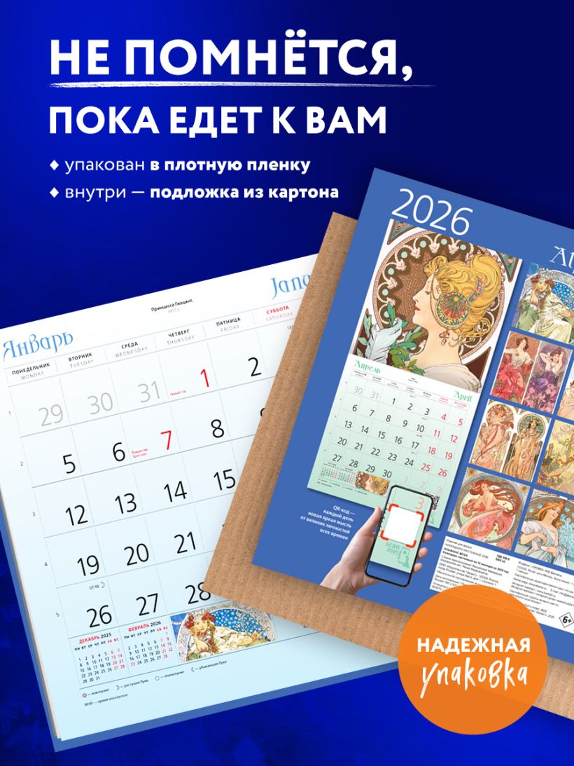 Практичный и эстетичный, этот календарь каждый месяц будет радовать вас. Прекрасные картины органично дополнят любой интерьер и помогут планировать время. В этом календаре представлены шедевры кисти Альфонса Мухи.