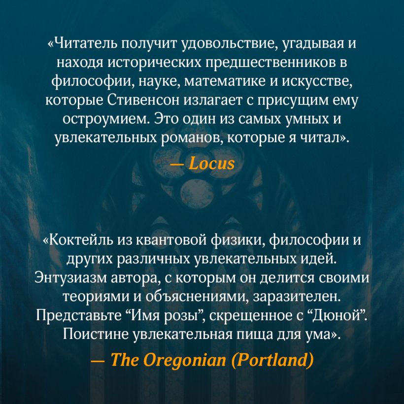 «Бурное и эмоциональное повествование Стивенсона перекликается с классическим “Гимном Лейбовица” Уолтера Миллера, космическими операми Ларри Нивена и философскими размышлениями Дугласа Хофштадтера — пьянящая смесь предшественников, которая обеспечивает множество часов великолепного развлечения». — Publishers Weekly