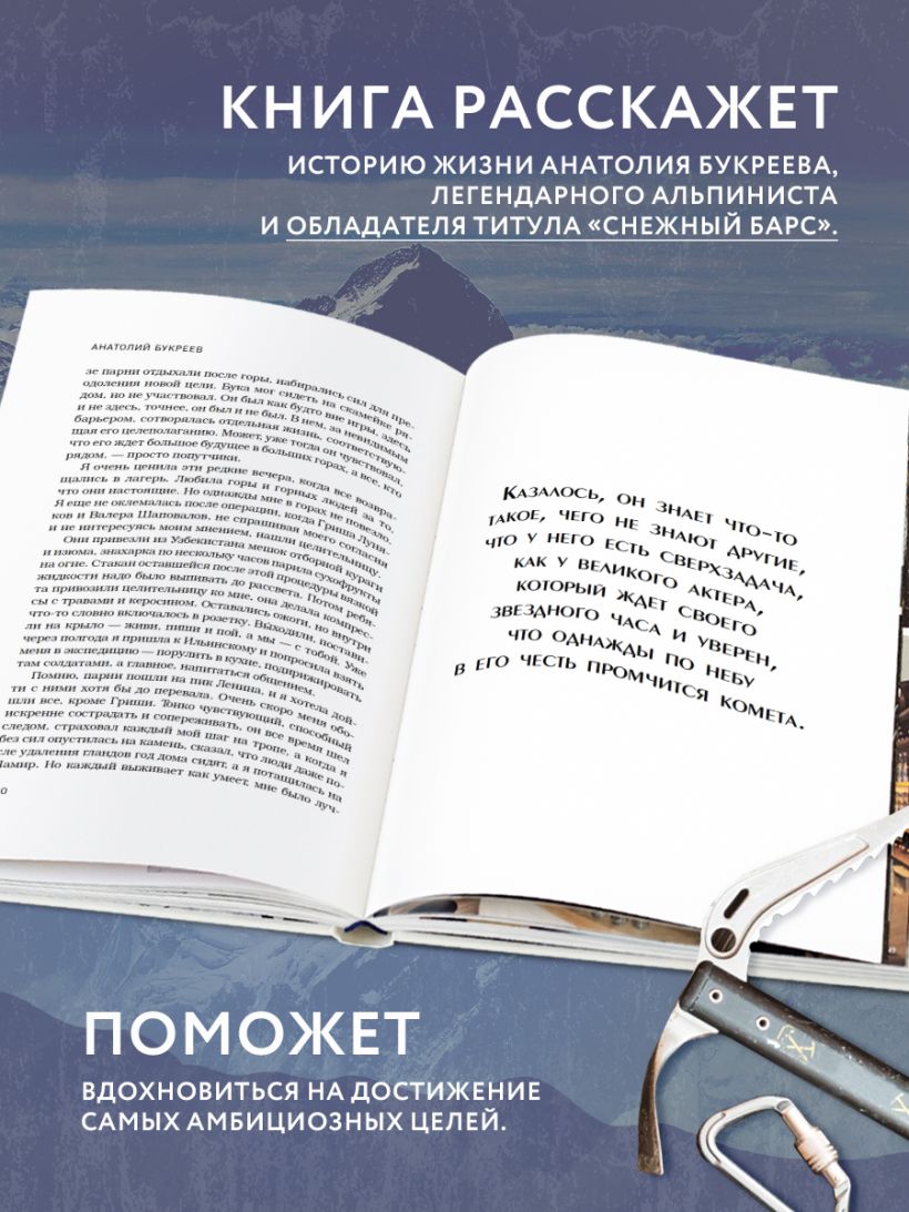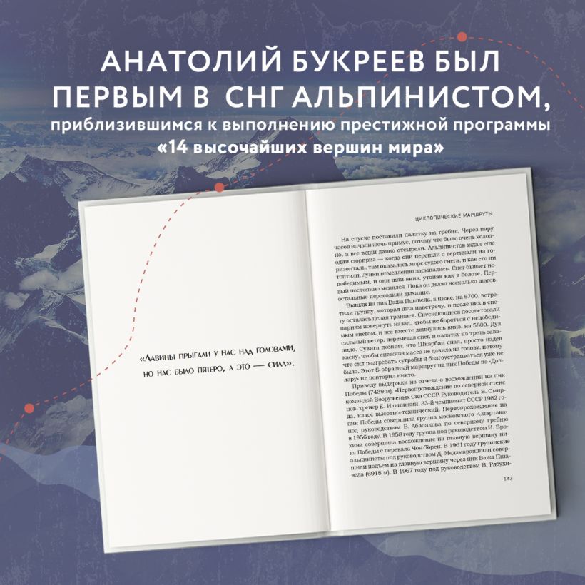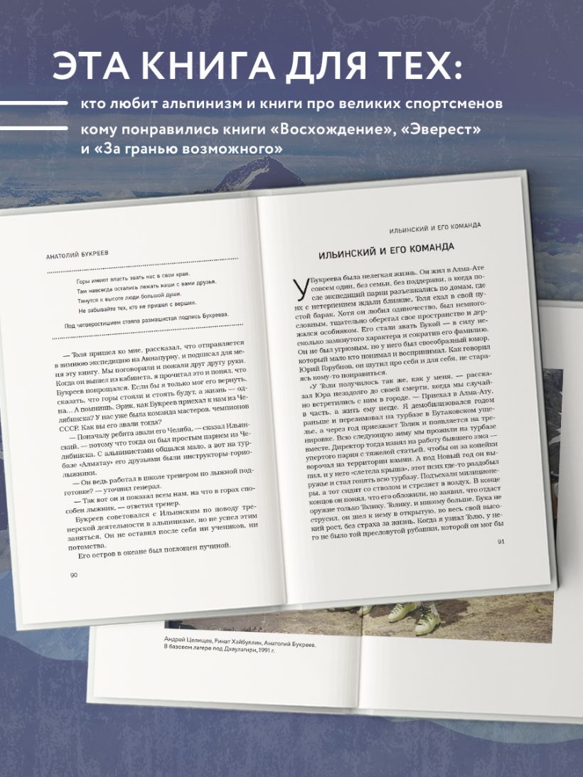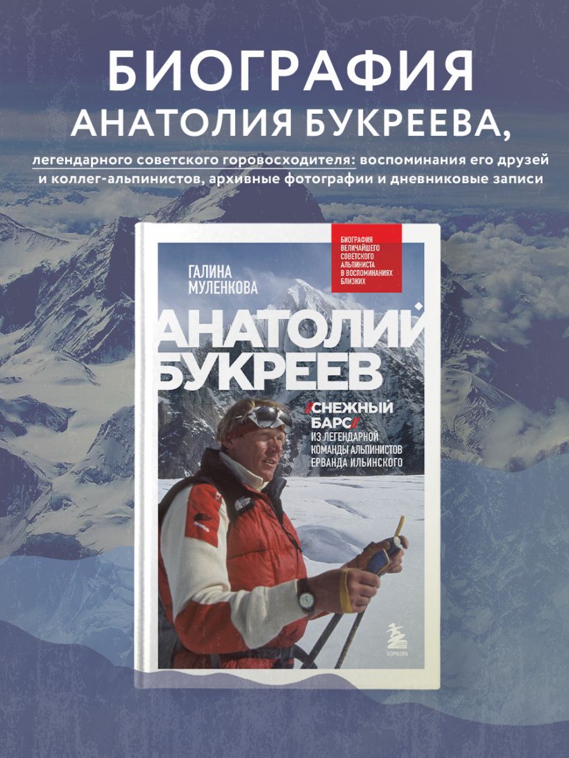 Перед вами книга, посвященная жизни горовосходителя Анатолия Букреева, или «Буки», — как звали его в альпинистском сообществе. Ее написала журналист, автор книг об альпинизме Галина Муленкова, которая была лично знакома с Анатолием, с командой, где Букреев вырос как спортсмен и как личность, а также с представителями других поколений команды легендарного тренера Ерванда Ильинского. В книге описаны основные этапы жизни Букреева, наиболее значимые экспедиции и восхождения. Благодаря уникальным интервью, воспоминаниям его друзей и товарищей вы сможете взглянуть на героя книги по-новому.