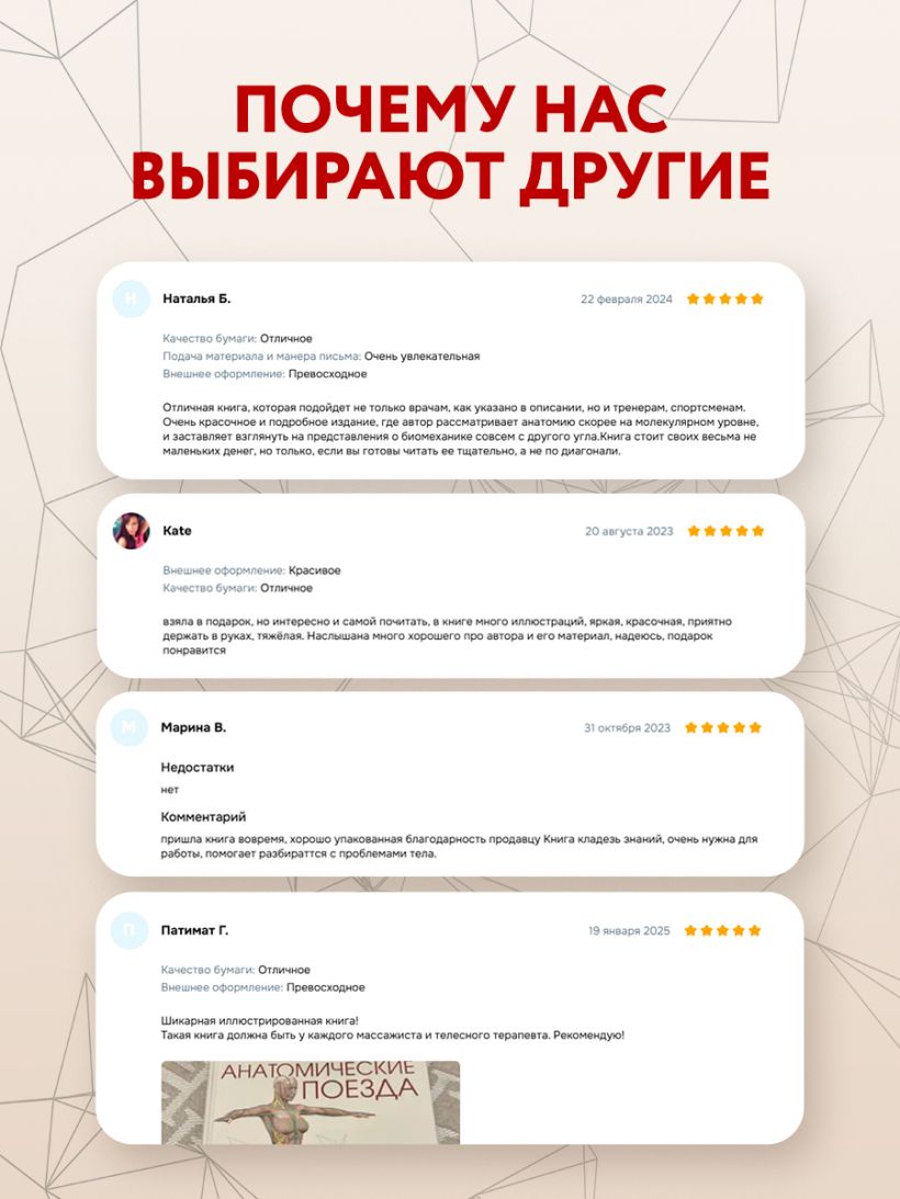 4-е издание «Анатомических поездов» позволяет получить многомерное понимание работы опорно-двигательного аппарата. Данный подход направлен на выявление истинных причин хронических болей в теле, которые чаще всего связаны с так называемыми «молчаливыми» областями. Благодаря работе с анатомическими поездами клиницисты могут разрабатывать новые, более эффективные стратегии лечения пациентов.