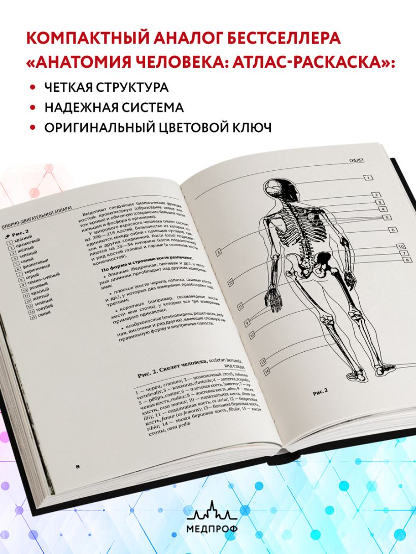 Компактный атлас-раскраска — для студентов медицинских вузов, людей, интересующихся строением человеческого тела, и просто для всех, кто хочет выучить анатомию быстро, просто и эффективно.