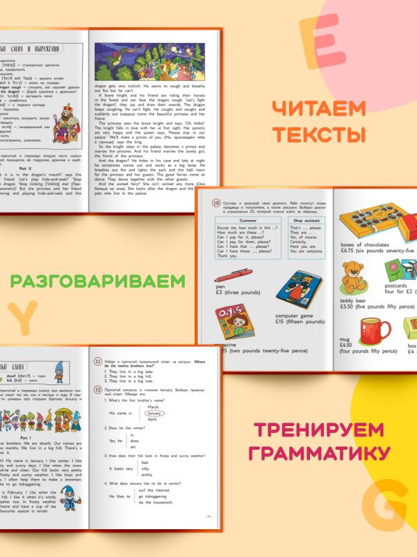 Грамматика английского языка может быть простой, увлекательной и понятной — без зубрежки и скучной теории. С этим тренажером вы сможете помочь ребенку легко освоить правила, познакомиться с артиклями, частями речи и превратить занятия в настоящую игру. Этот тренажер создан для того, чтобы сделать обучение ребенка легким и интересным. Здесь грамматика в буквальном смысле оживает! Глагол Can — настоящий «умелец», частица Not — вредная «вредина», а глагол Have — «богач», у которого все есть. Грамматические понятия становятся запоминающимися персонажами с историями, которые дети легко понимают и с удовольствием запоминают. Сложные темы перестают пугать, а начинают удивлять и радовать! Об авторе: Марият Меджидова — преподаватель со стажем преподавания более 17 лет, основатель экспертного сообщества для преподавателей Elementary_English. В основе методики — игровая мнемоническая техника, с которой ребенок легко и быстро начинает понимать логику английского языка! С первых уроков ваш ребенок сможет: * Рассказывать о том, что он делает каждый день (`I play, I eat`). * Говорить о том, что он умеет или не умеет (`I can swim, I can’t dance`). * Описывать, что у него есть (`I’ve got a cat`). * Рассказывать, какой он, его друзья или любимый персонаж (`He is brave, She is kind`). * Освоить множество других тем с помощью игровых заданий и авторских карточек. На протяжении всей книги размещены подсказки для родителей, а в конце — удобный словарик по урокам и ответы к заданиям. Занимайтесь с удовольствием вместе с ребенком!