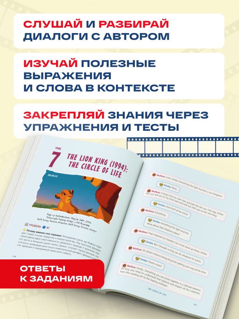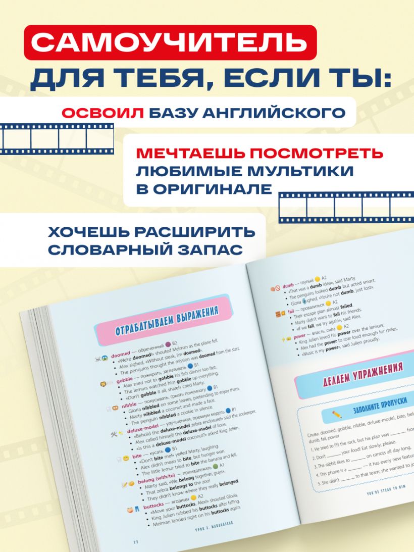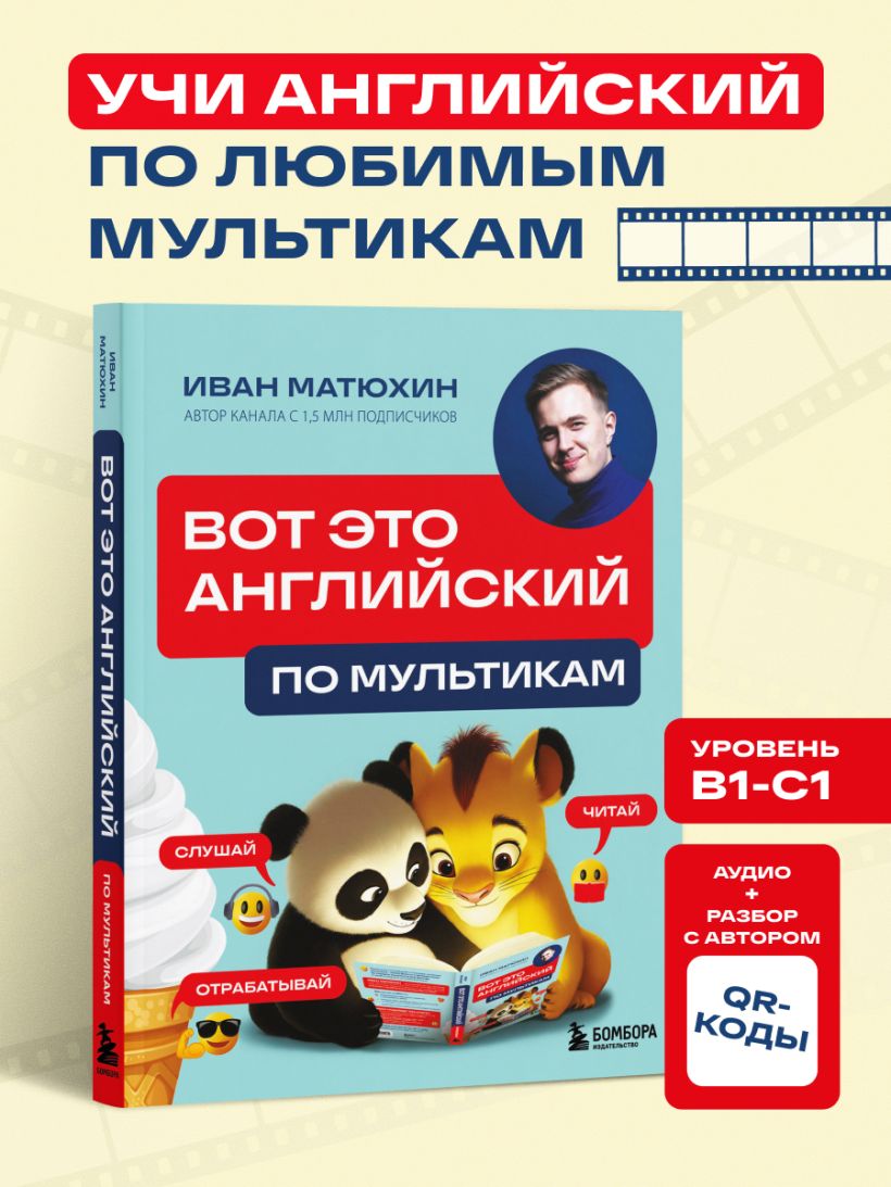 Перед вами книга-проводник в мир английского, которая возвращает к любимым сценам из мультфильмов и превращает обучение в живой и увлекательный процесс. Внутри вы найдёте 20 фрагментов с разбором лексики, упражнениями, тестами и ответами, а также аудиоразбор от автора книги и канала “ВОТ ЭТО английский” Ивана Матюхина. Благодаря удобному формату вы сможете писать, отмечать новые слова и выражения прямо в книге, повторять материал в любое удобное время, а также заниматься вместе с детьми, знакомя их с героями вашего детства. Обо всем подробнее расскажет во введении сам автор. Приятного обучения!