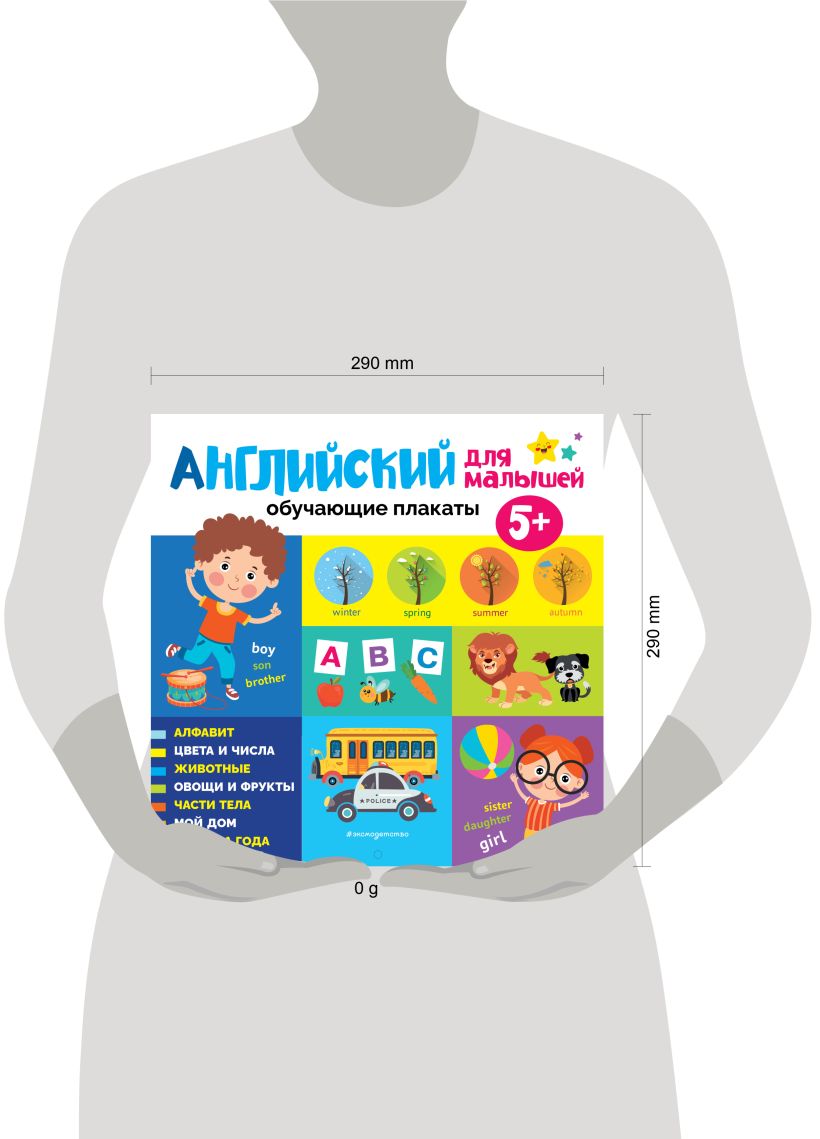 Необычное пособие в виде плакатов для изучения английского языка — прекрасный подарок ребёнку. Конструкция альбома предполагает, что его можно повесить на стену наподобие календаря и менять плакаты по мере усвоения дошкольником материала. Яркие иллюстрации, крупные буквы и удобная структура альбома помогут ребёнку легко выучить первые английские слова. Необходимый материал всегда будет перед глазами ребёнка. Это способствует его лучшему запоминанию. Обучающие плакаты можно использовать для оформления детской комнаты и в качестве наглядных пособий в детском саду. Пособие поможет дошкольнику сделать первые шаги в изучении иностранного языка, чтобы потом с удовольствием продолжать это занятие.