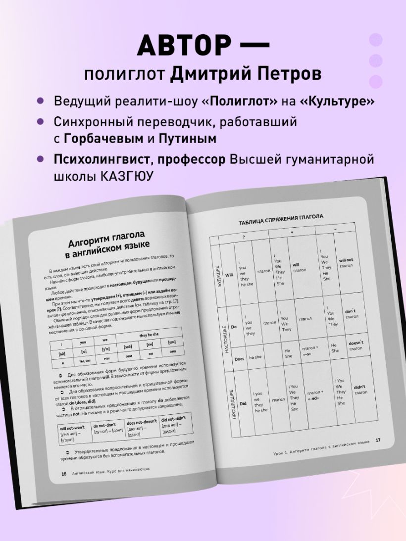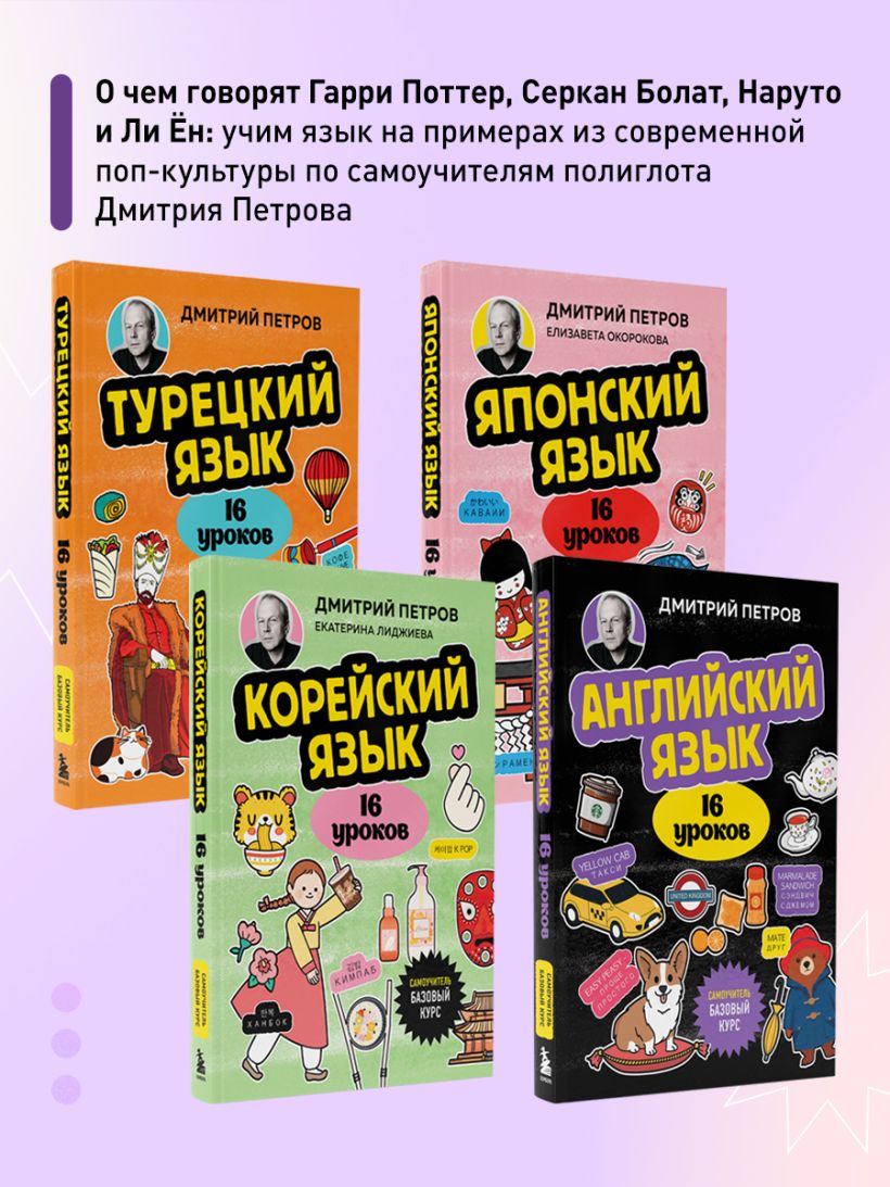 Это серия самоучителей от знаменитого полиглота и синхронного переводчика Дмитрия Петрова. Он уверен: чтобы заговорить на иностранном языке, совсем не обязательно посвящать его изучению десятилетия. Гораздо важнее освоить базовые алгоритмы, плюс — минимально необходимый для общения запас слов.