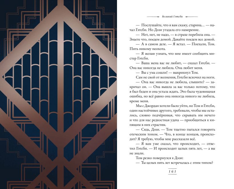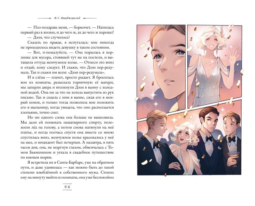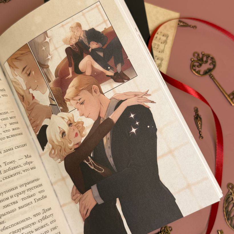 Под стильной обложкой, отсылающей нас к японской манге, размещено 6 цветных полосных иллюстраций с комиксовыми элементами. Композиция кадра, яркие образы и характеры персонажей — всё детально продумано талантливым художником Кэтрин Рэй. На каждой иллюстрации — динамичное сочетание фреймов, которые проводят нас по всем главным событиям из жизни Джея Гэтсби — от счастливой встречи с Дэзи до трагического финала.
