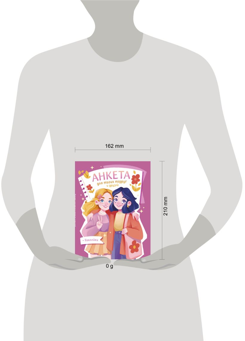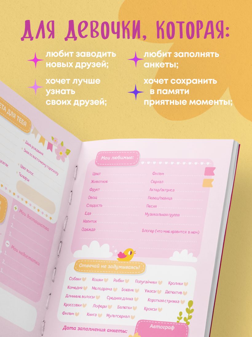 Анкета — просто незаменимый атрибут для каждой девочки! Она идеально подходит для той, которая: - хочет лучше узнать своих подруг и друзей; - хочет сохранить в памяти все приятные моменты и воспоминания; - любит знакомиться с новыми людьми и заводить новых друзей; - любит заполнять анкеты, проходить тесты и составлять подборки любимых книг, фильмов и т.д. С его помощью девочка сможет: - заполнить собственную анкету; - предложить каждому другу и подруге заполнить анкету; - узнать что-то новое о себе и своих друзьях. Технические параметры: - удобный формат А5 (162×210 мм); - 32 страницы на плотной офсетной бумаге; - стильная обложка из лакированного картона; - яркий блок. - стильные наклейки-стикеры. Красочно оформленная анкета станет отличным подарком для девочки младшего и среднего школьного возраста. А качественные материалы, из которых она выполнена, позволят сохранить записанное в него на долгие годы.