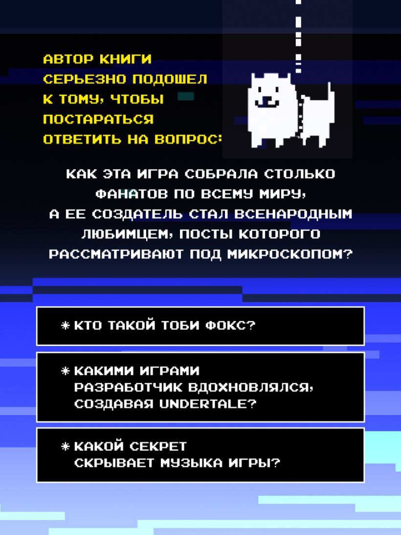 «Если вы читаете этот отзыв, значит, вы достаточно опытны и для знакомства с книгой, которую держите в руках. Ведь внутри... тоже текст. Много текста. И еще больше любви к Undertale». — Катерина Краснопольская, автор игрового портала «StopGame»