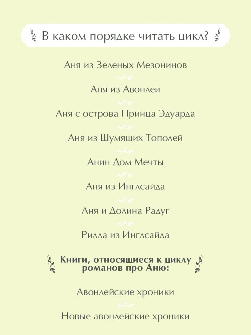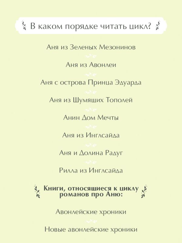 История, начавшаяся с «Ани из Зелёных Мезонинов», по-прежнему привлекает внимание миллионов людей по всему миру благодаря героям, которых создала Люси Мод Монтгомери, их сплочённой семье. Доброе чтение, которое погружает в атмосферу уюта и тепла, которых так не хватает в наш стремительный и порой жестокий век.