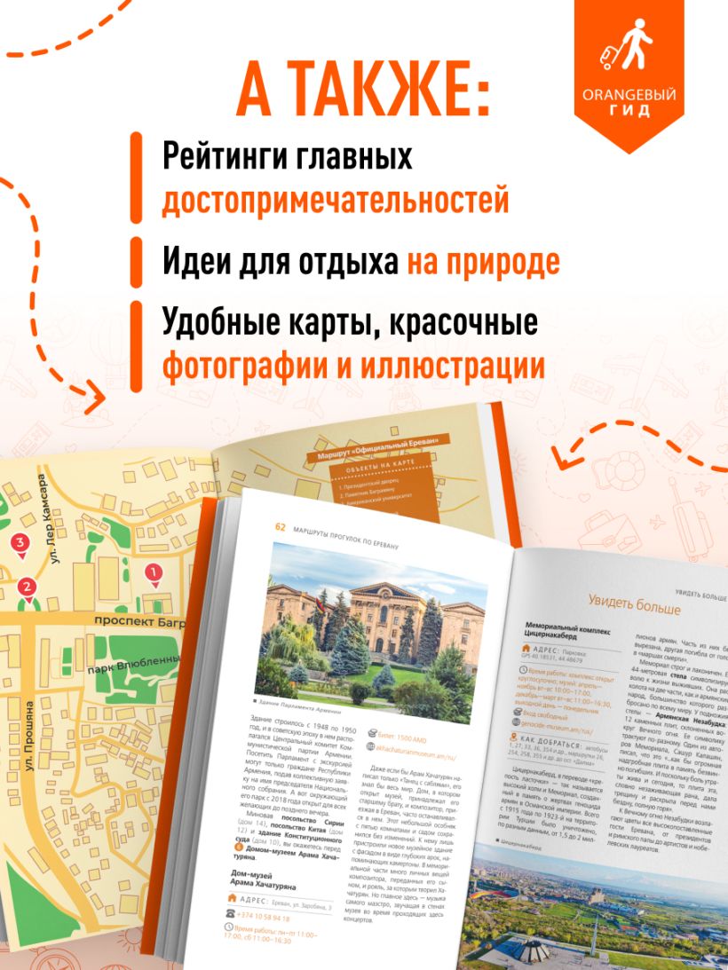 Вас ждут варианты прогулок по Еревану, а также готовые маршруты поездок по главным достопримечательностям Армении. Сориентироваться на местности помогут удобные карты, расположенные на страницах путеводителя.