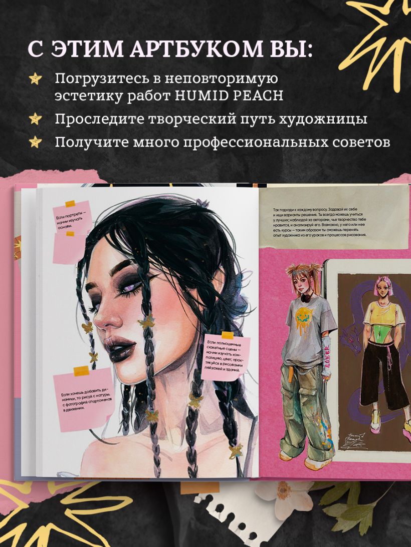 Этот артбук — не просто коллекция работ, а искреннее отражение творческого пути HUMID PEACH. Художница делится секретами, которые помогли ей пройти по карьерной лестнице от новичка к профессионалу: как сохранять мотивацию, как выбрать правильные инструменты, как развивать навык без профильного образования. В этом артбуке собраны не только её вдохновляющие иллюстрации, но и философия художника: как важно не бояться идти своим путём, доверять своим ощущениям и видеть красоту в каждом шаге развития.