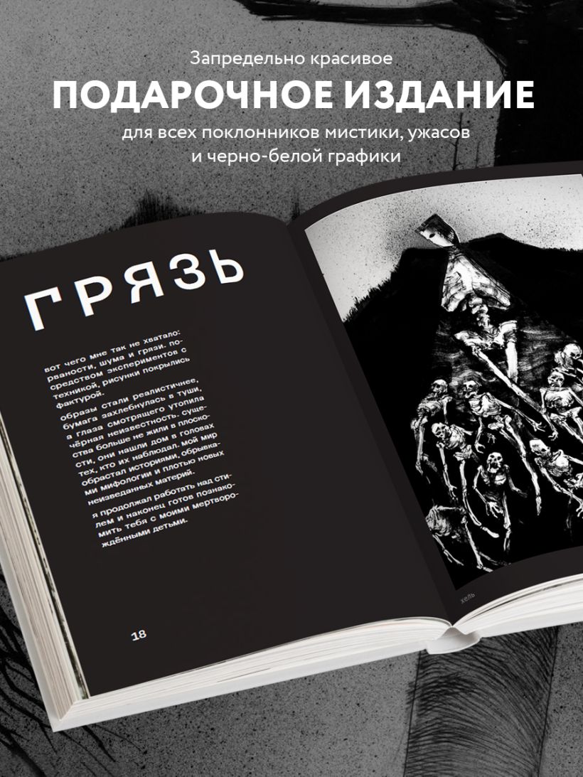 Готовы погрузиться туда, где рождаются кошмары? В этом артбуке под одной обложкой собраны работы 20 выдающихся представителей российского темного искусства. Вас ждут таинственные мотивы, эстетика мрака и атмосфера ужаса, которая таится во всем, что нас окружает. Присмотритесь внимательнее к страницам артбука, и вы увидите «ожившие» болезни, переплетения обнаженных тел и голых ветвей, метаморфозы героев русских сказок, а также: – «живописный жуткий скетч» художника Goshmar; – монохромный ужас Дмитрия Храмцова; – мрачный минимализм питерского художника под псевдонимом Валун; – мистика безысходности на снимках фотографа Дианы Левандовской; – космический ужас в работах художника Stan art. Артбук придется по вкусу коллекционерам дарк арта и ценителям пугающих образов в музыке, кино, играх и литературе. Он также заинтересует любителей хоррор-культуры и всех, кто готов встретиться лицом к лицу со своими страхами.