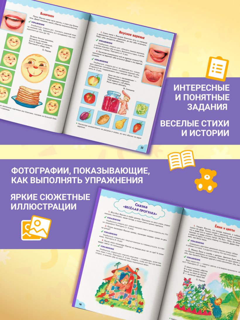 Яркие сюжетные иллюстрации, интересные и понятные задания, веселые стихи и истории, фотографии, показывающие, как выполнять упражнения, сделают занятия легкими и приятными для ребенка и взрослого.