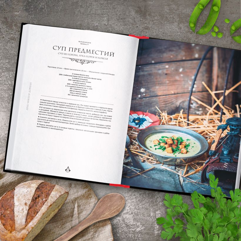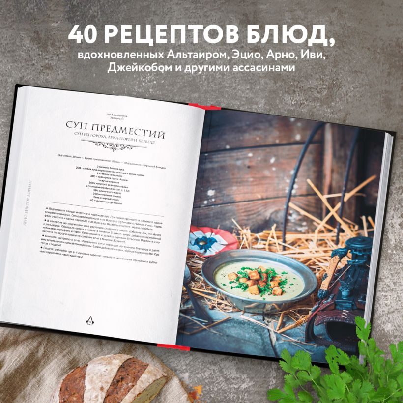 В книге представлено 40 рецептов блюд, разделенных на 10 меню, вдохновленных временем и местом, где сражались самые известные ассасины. Отправляйтесь в гастрономическое приключение, оживите времена итальянского Возрождения, Французской революции и викторианской Англии. Следуйте за Альтаиром, Эцио, Арно, Иви, Джейкобом и другими членами братства, наслаждаясь их любимым блюдами, такими как мутабаль из Масиафа, суп поместья Девенпорт, бостонский яблочный пирог, колониальный коул слоу, меренги Мирабо и многими другими.