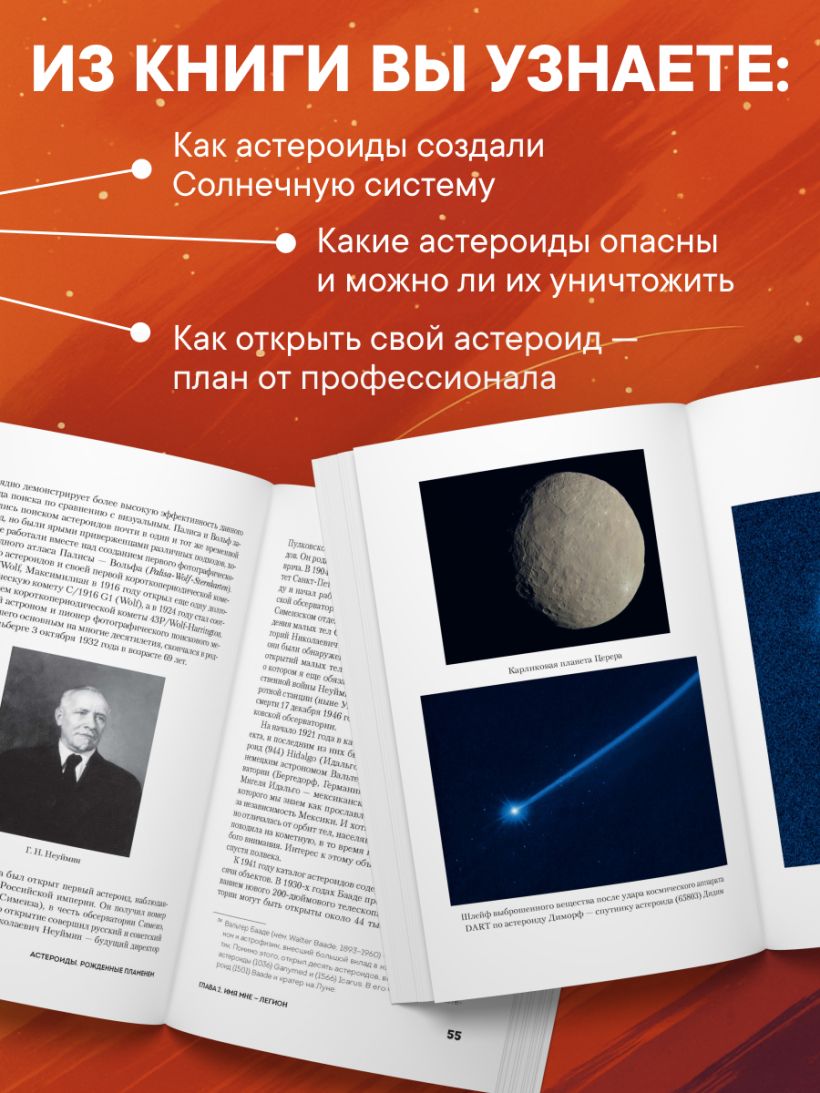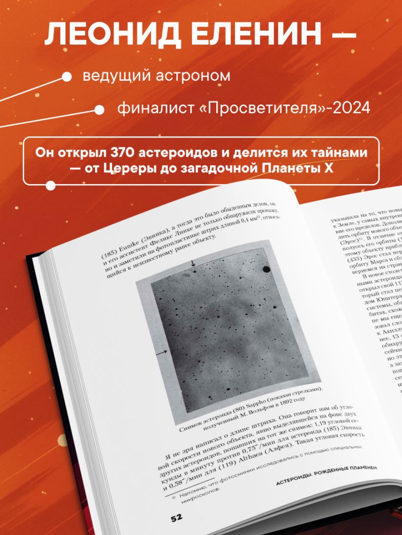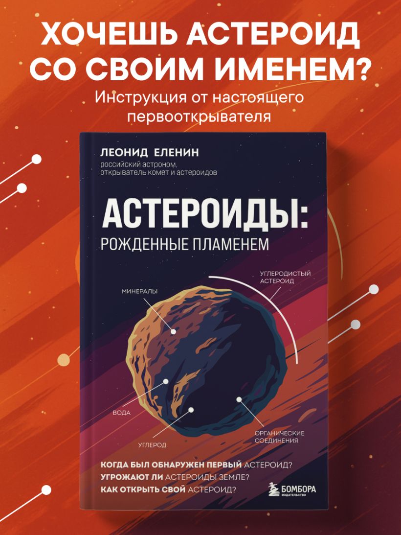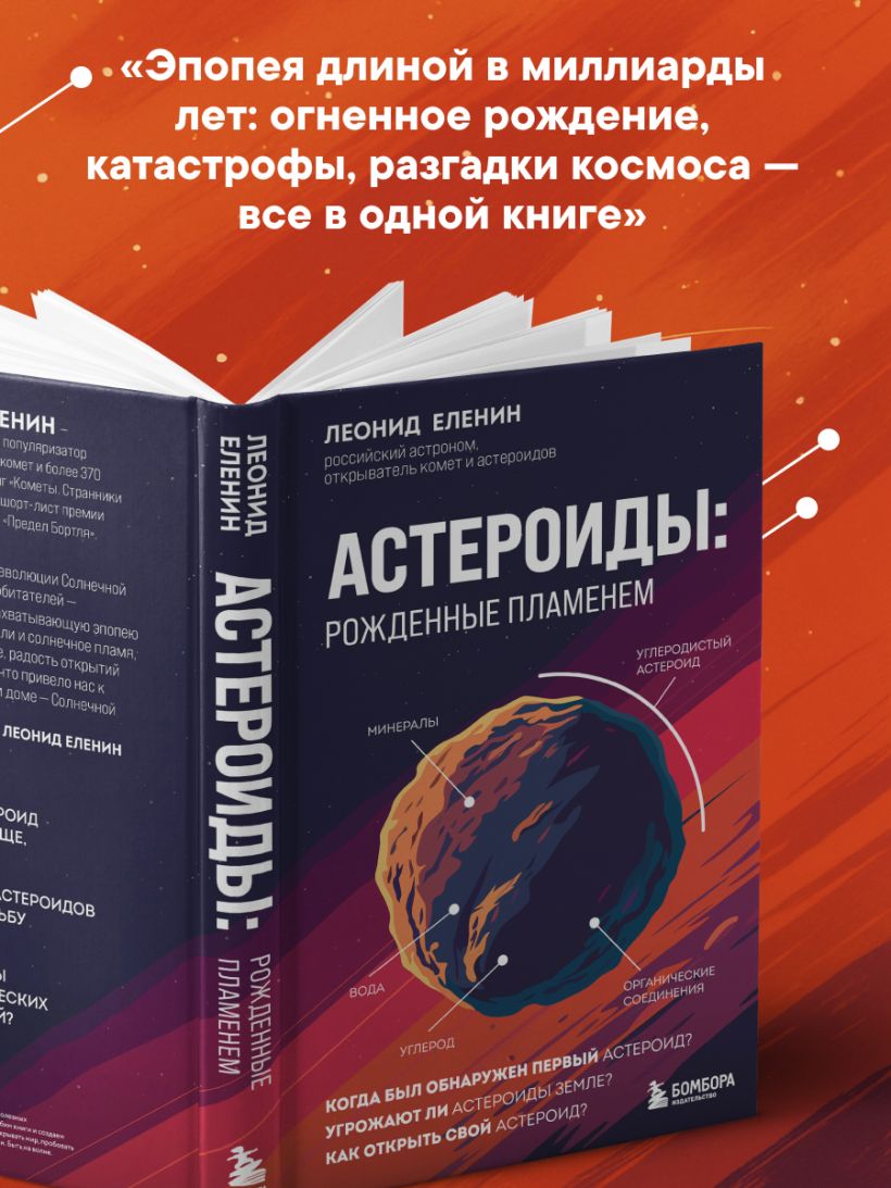 «Моя книга — история формирования и эволюции Солнечной системы и ее самых многочисленных обитателей — астероидов. Мы погрузимся в захватывающую эпопею длиной в миллиарды лет, в которой были и солнечное пламя, и грандиозные столкновения, познание, радость открытий и разгадки космических тайн — все то, что привело нас к современным знаниям о нашем общем доме — Солнечной системе». — Леонид Еленин, российский астроном, популяризатор науки, открыватель 6 комет и более 370 астероидов, автор книг «Кометы. Странники Солнечной системы» (шорт-лист премии «Просветитель» 2024), «Предел Бортля»