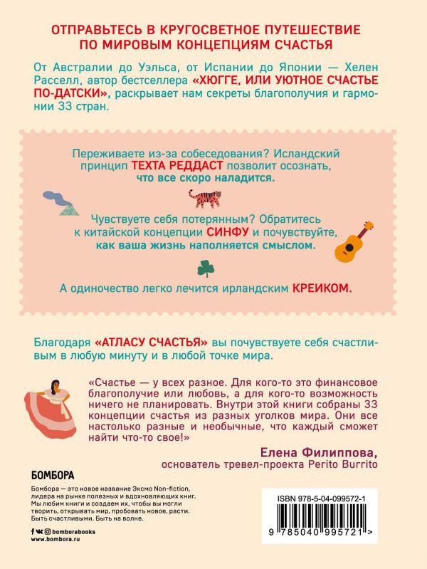 «Счастье — у всех разное. Для кого-то это финансовое благополучие или любовь, а для кого-то возможность ничего не планировать больше, чем на два дня вперед. Путешествуя, мы часто сталкиваемся с мироощущением других народов, которое может оказаться гораздо ближе, чем культура и традиции наших родных мест. Внутри этой книги собраны 33 концепции счастья из разных уголков мира (от турецкого кейфа до валового национального счастья Бутана). Они все настолько разные и необычные, что каждый сможет найти что-то свое!» — Елена Филиппова, основатель тревел-проекта Perito Burrito