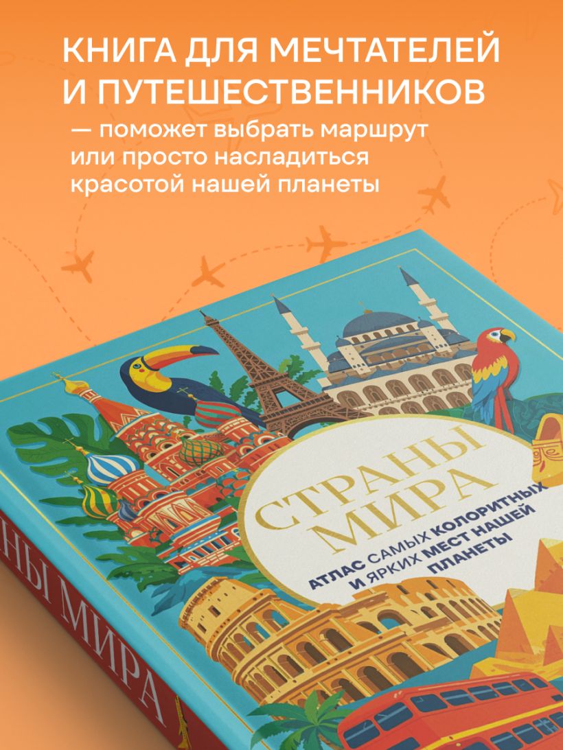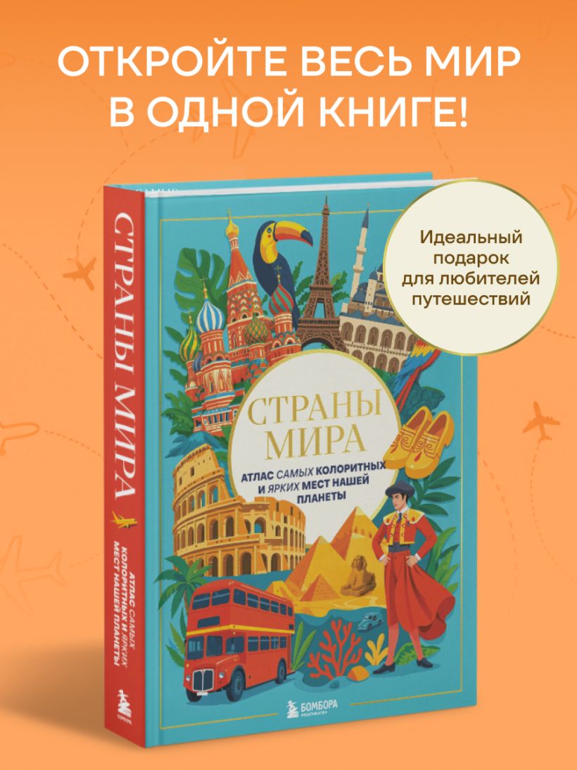 Книга удобно поделена на разделы — части света — и их самые интересные государства. Вы сможете насладиться красивыми фотографиями достопримечательностей, городов и изумительных природных мест! Мы собрали множество занимательных фактов про каждую из стран: главное блюдо, самые известные жители, что можно привезти в качестве сувенира, и другая полезная информация для того, чтобы вы смогли определиться с будущей поездкой!