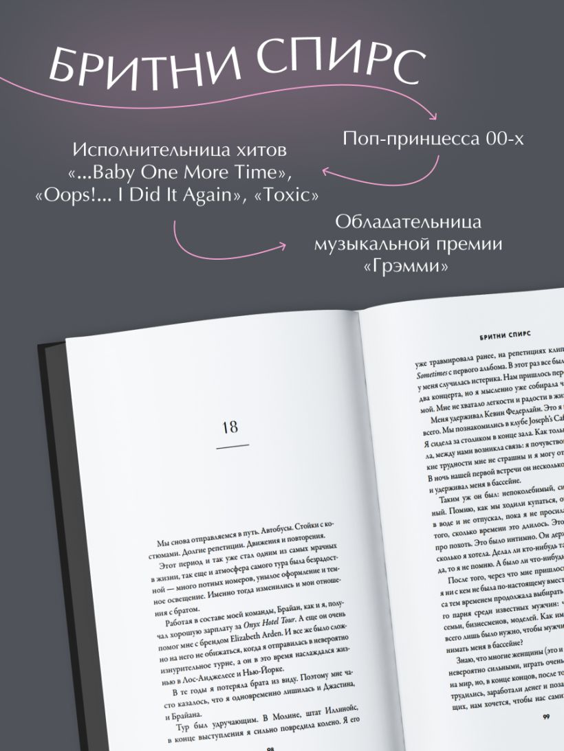 Бритни прошла через все это, сломавшись, но все-таки обретя себя. Искренняя история певицы демонстрирует исцеляющую силу музыки и любви. Это беспрецедентный монолог женщины, которая наконец получила право высказаться. И теперь ее голос по-настоящему услышал весь мир. Услышьте ее и вы.
