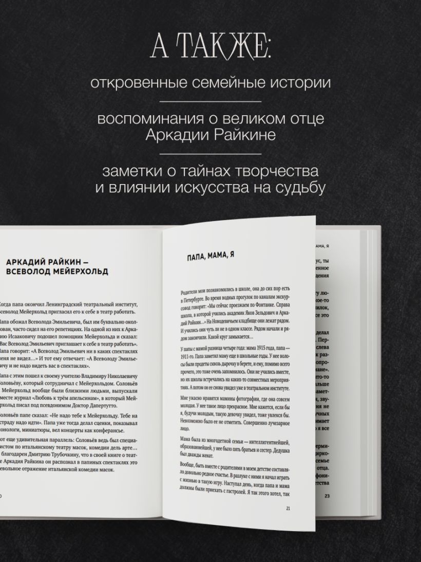 Семейные истории — тёплые воспоминания о выдающихся родителях — Аркадии Райкине и Руфь Райкиной-Иоффе — и о доме, где всё начиналось.