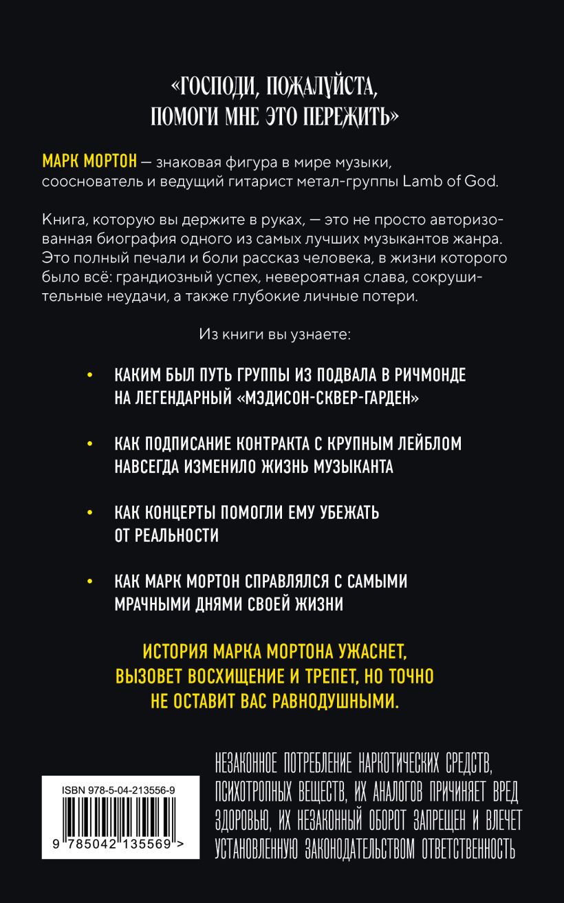 Книга, которую вы держите в руках, — это не просто авторизованная биография одного из самых лучших музыкантов жанра. Это полный печали и боли рассказ человека, в жизни которого было всё: грандиозный успех, невероятная слава, сокрушительные неудачи, а также глубокие личные потери. Каким был путь группы из подвала в Ричмонде на легендарный «Мэдисон-сквер-гарден»? Чья музыка может довести Мортона до слез? Что помогло Марку Мортону справиться с потерей новорождённой дочери? История Марка Мортона ужаснет, вызовет восхищение и трепет, но точно не оставит вас равнодушными.