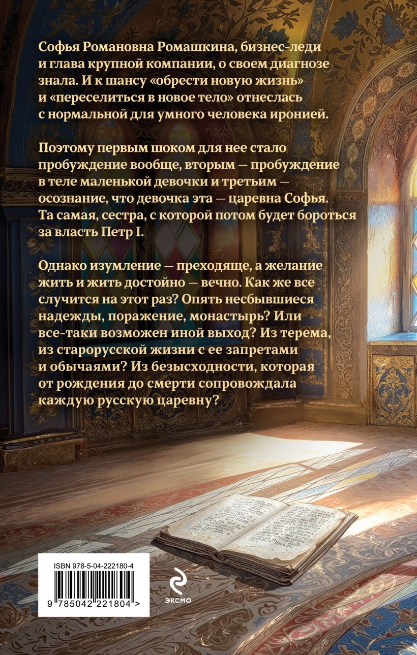 Софья Романовна Ромашкина, бизнес-леди и глава крупной компании, о своем диагнозе знала. И к шансу «обрести новую жизнь» и «переселиться в новое тело» отнеслась с нормальной для умного человека иронией. Поэтому первым шоком для нее стало пробуждение вообще, вторым — пробуждение в теле маленькой девочки и третьим — осознание, что девочка эта — царевна Софья. Та самая сестра, с которой потом будет бороться за власть Петр I. Однако изумление — проходяще, а желание жить, и жить достойно, — вечно. Как же все случится на этот раз? Опять несбывшиеся надежды, поражение, монастырь? Или все-таки возможен иной выход? Из терема, из старорусской жизни с ее запретами и обычаями? Из безысходности, которая от рождения до смерти сопровождала каждую русскую царевну?