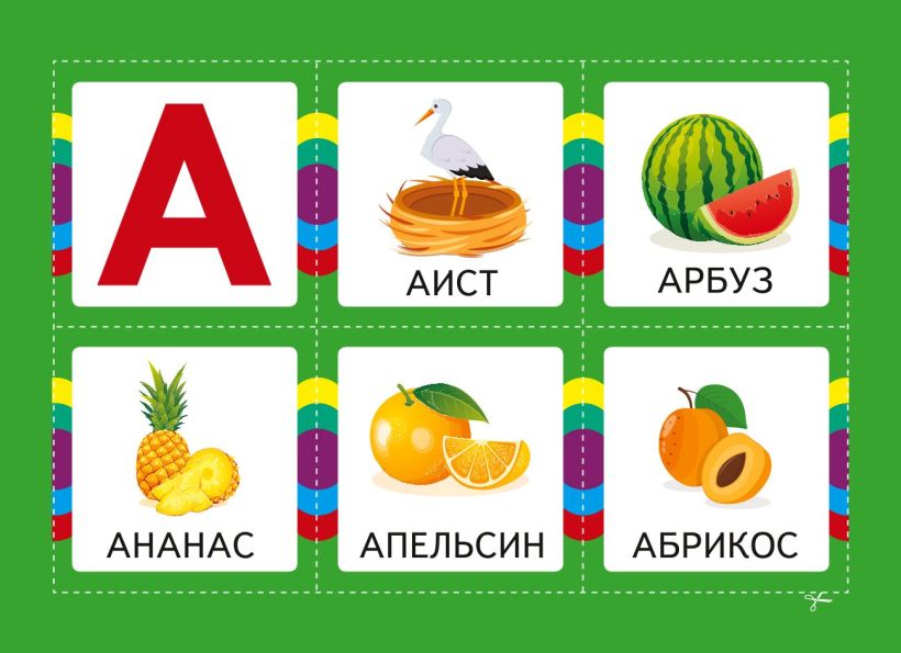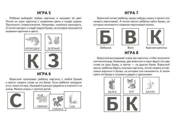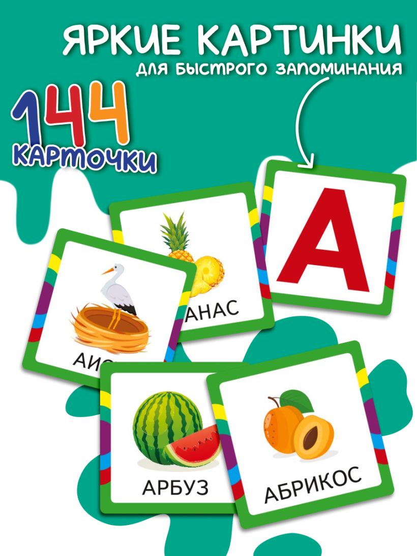 Карточки для развивающих игр — это эффективный инструмент, который поможет ребёнку запомнить буквы русского алфавита, научиться находить их в словах, сделать первые шаги к осознанному чтению, развитию речи и подготовке к школе. Играть с обучающими карточками весело и увлекательно! Они подходят как для занятий дома, так и в детском саду. Набор представляет собой 24 картонных листа, каждый из которых ребёнок самостоятельно может разрезать на 6 частей. И у него будет 144 цветные карточки с буквами и картинками, которые можно использовать и как карточки для запуска речи, способствующие развитию речевых навыков и увеличению словарного запаса. В наборе есть брошюра-раскладушка с подробными методическими рекомендациями, которые помогут взрослым правильно организовать обучающие игры, и цветная книга с заданиями. Занимаясь по ней, ребёнок сможет закрепить изученный материал. Упражнения из книги можно рассматривать в качестве тестовых заданий для контроля полученных знаний и навыков. Играя с карточками, и рассматривая яркие картинки, дети 3-4-5 лет быстро и легко выучат буквы русского алфавита, увеличат свой словарный запас, улучшат понимание языка и в дальнейшем будут читать осознанно. Карточки прекрасно оформлены и станут отличным подарком мальчикам и девочкам к любому празднику.